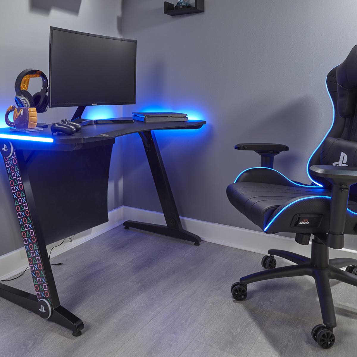 The all-new Play. Station Borealis is an officially licensed gaming desk featuring the iconic Play. Station brand, multi-coloured PS symbols and cool blue LED edge lighting for maximum style effect. For multi-monitor gamers, the Borealis features a wide desktop area and an innovative cable management system built into the legs for a clean and efficient setup. Perfect for next-gen console gaming, this X Rocker x Play. Station gaming desk is a must-have for any games room or office space.