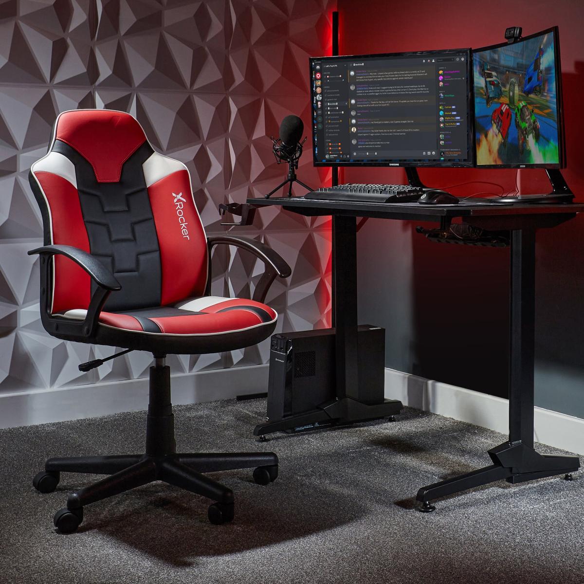 * Gaming chair * Height adjustable seat* Rich faux leather material* Foam padded filling* Supportive armrests * 1 year guarantee included Perfectly sized for kids and teens, the X Rocker Saturn Midback Junior Esport Gaming Chair has a mid-back design and is finished with a striking e Sports racing style. Upholstered in a soft and durable faux leather with foam padded seats and backrest, you can rely on this office/gaming chair for comfortable long-term gaming or study sessions as the naturally curving backrest creates additional lumbar support. Using a gas lift mechanism, this chair allows you to adjust the seat height to keep your feet flat on the floor and lift the armrests to create the optimal anchor point for gaming as well as a 360-degree swivel pedestal base to adjust to each growing user.