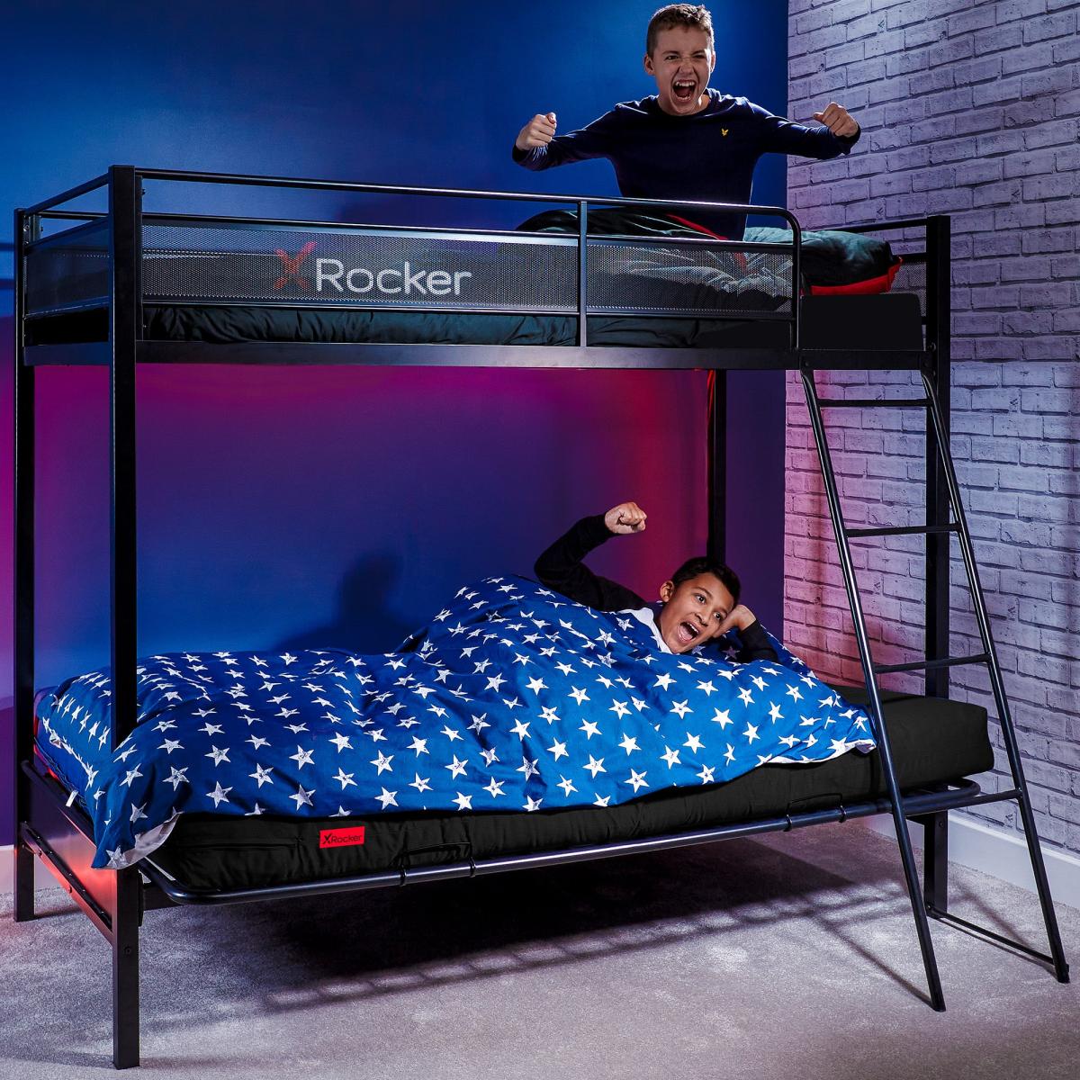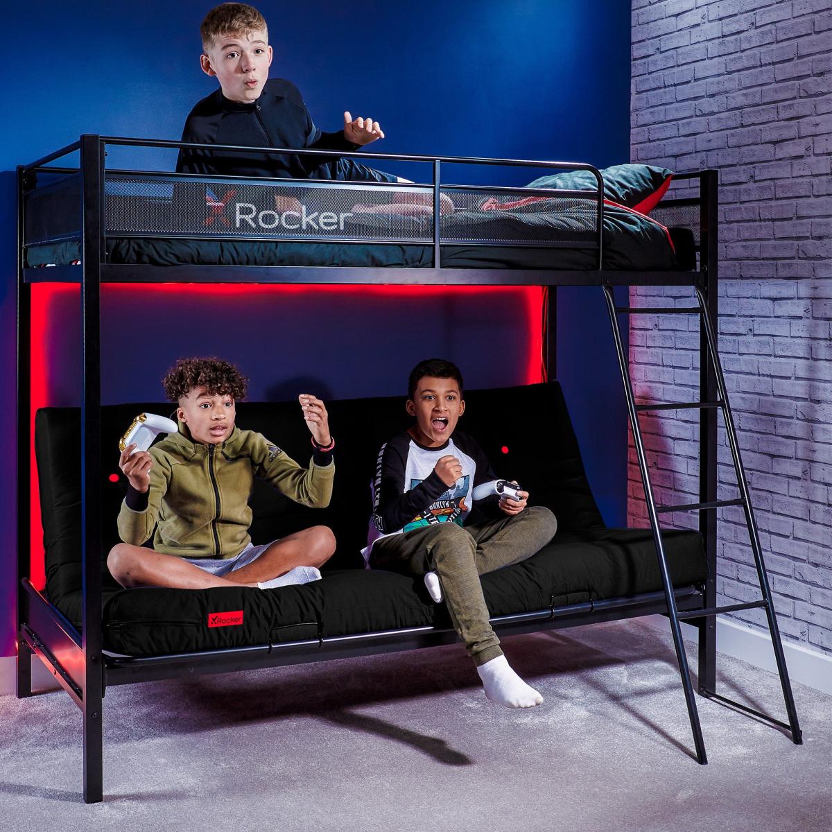 * High Sleeper Bed Frame* Crafted from Strong Metal* Futon for Lounging* Converts to Sofa Bed Perfect for hosting gaming sleepovers, the bottom bunk offers the classic comfort of a large sofa, ideal for lounging or playing games, and can be effortlessly laid flat to transform into a double-sized futon bed, offering the best of both worlds. The package includes a double 4ft6 futon cushion for enhanced comfort (LE Ds not included). Crafted with elevated comfort in mind, the high sleeper bunk bed design features a sturdy metal frame and bed slats, ensuring long-lasting comfort for extended gaming or relaxation sessions. The inclusion of a comfortable folding futon cushion adds versatility to the bed. The futon sleeping platform easily folds up into a large sofa, accommodating seating for three, or lays flat as a double guest bed for sleepovers, making it ideal for hosting friends or fellow gamers. With the ability to sleep up to three people as a triple sleeper bed, featuring a standard UK single (3ft) top bunk and a double (4ft6) futon bed size, the Stronghold Gaming High-Sleeper with Futon Cushion provides the perfect combination of functionality and comfort for a gaming haven like no other.