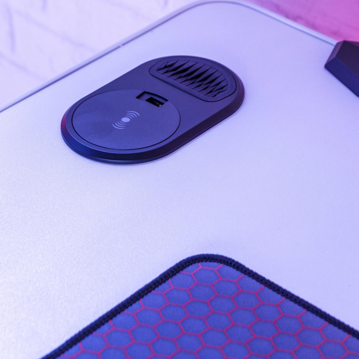 Light up your gaming set up with X Rocker’s innovative Neo Fibre LED lighting technology and this futuristic carbon fibre effect design. Built for style and practicality, this white coloured gaming desk is enhanced with high tech functionalities and versatile storage, perfect for displaying gaming accessories in the open space and snacks and controllers in the neat drawer. Equipped with wireless charging technology, you’ll never have to worry about your battery being on low or disconnecting as the built-in charge pad delivers up to 15W of charge power once activated (USB power supply not included, use in conjunction with the manufacturer's phone charger for best results). To boost the ultra-cool looks in your den, the innovative LED lighting provides a unique and colourful glow to your gaming set up with multi-colour options to choose from. Powered by a built-in control panel that connects via USB Type-A cable to your power supply (wall adapter or power bank and remote control not included).
