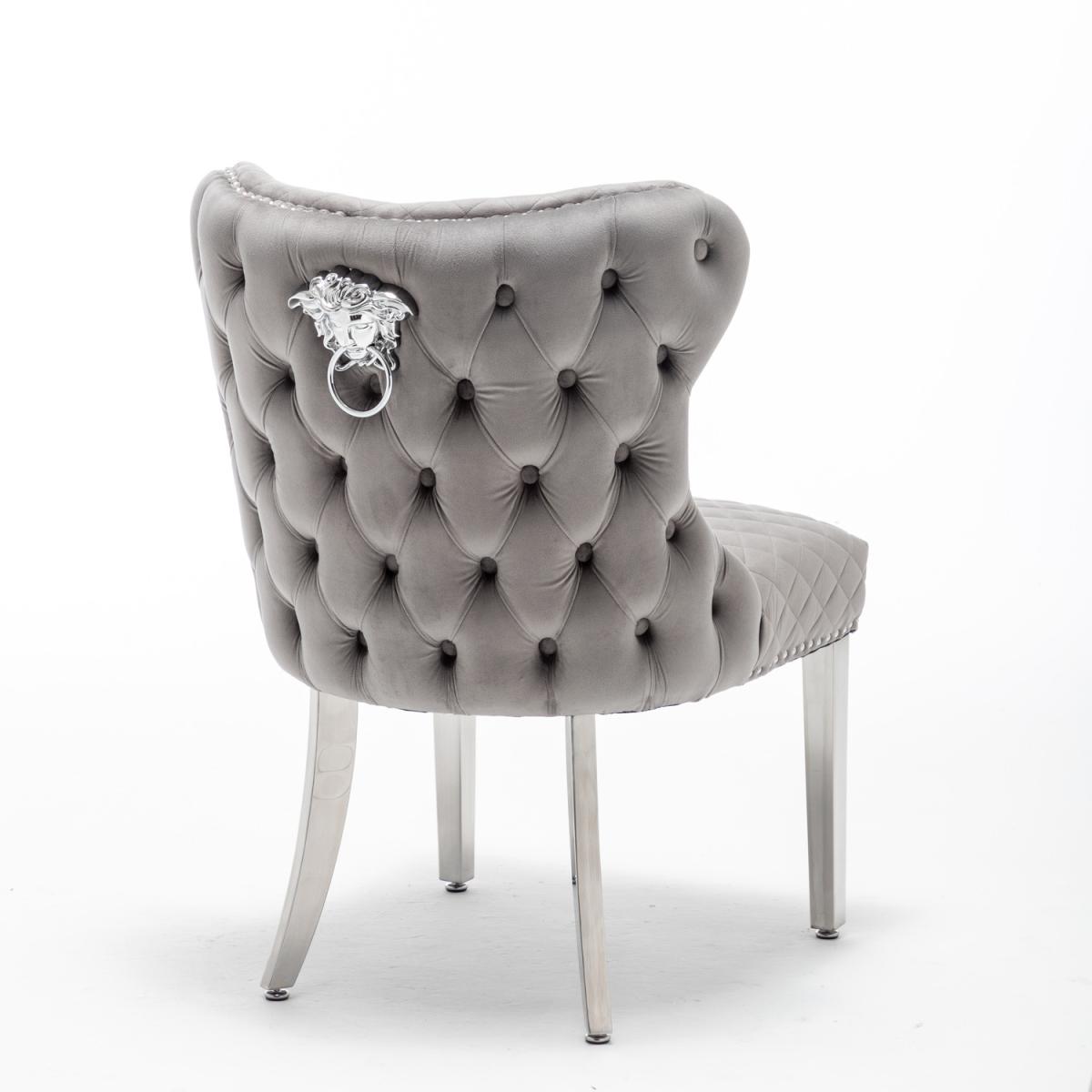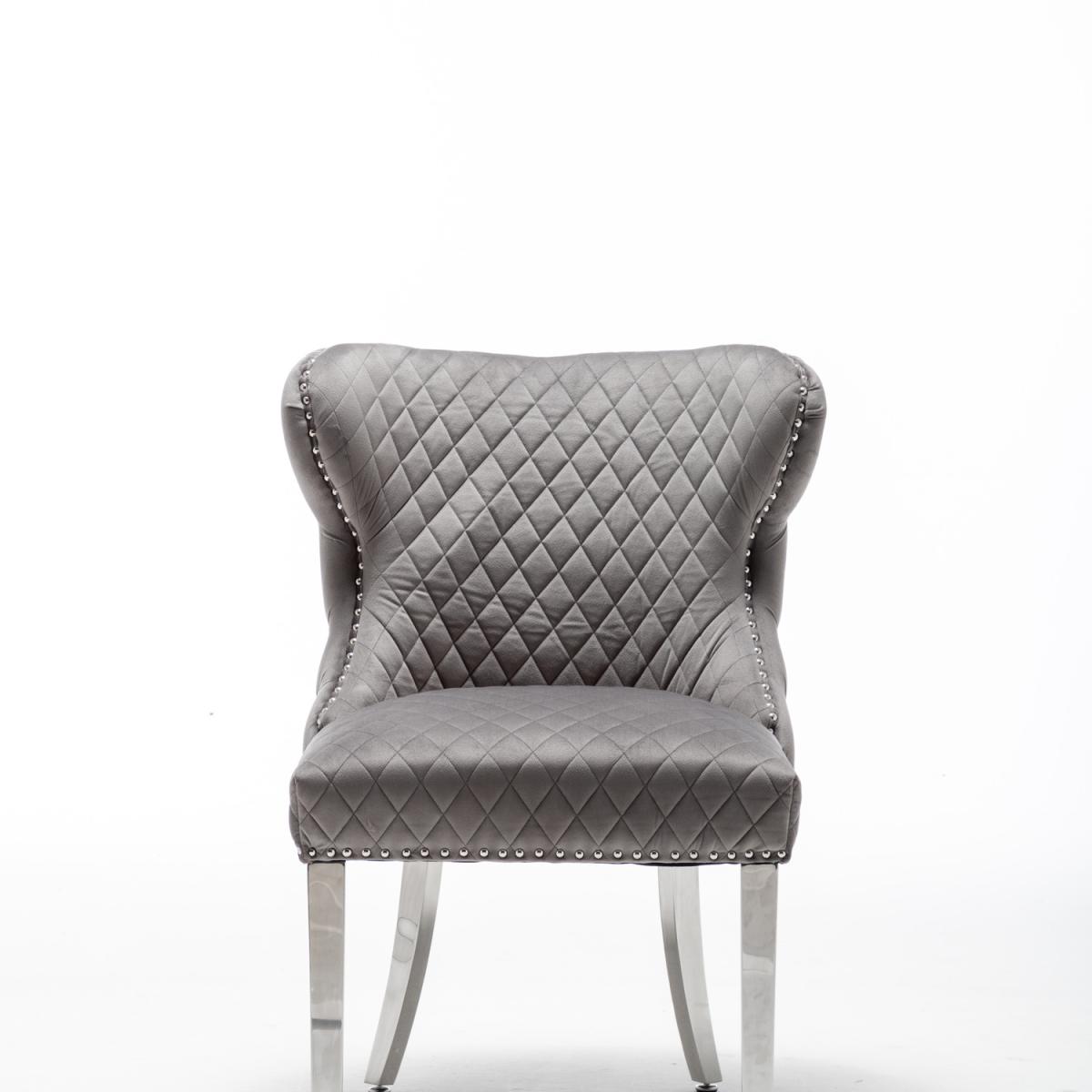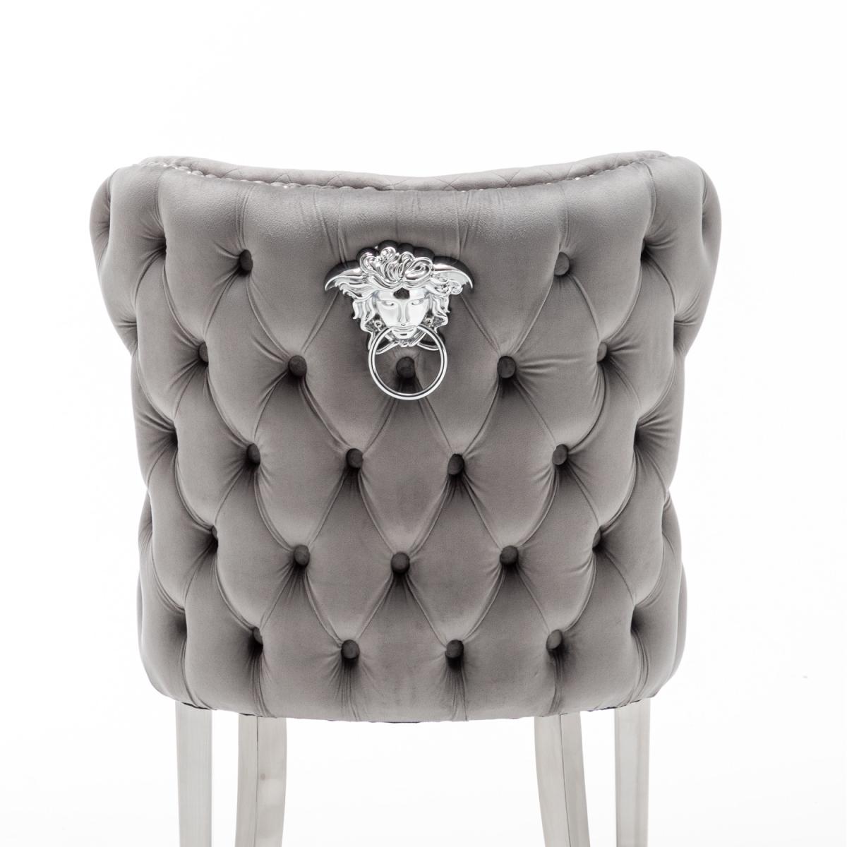 The Medusa collection is sure to make a bold statement with its sensational Medusa (Medusa is Trademark registered to Guru Kirpa (UK) Ltd.) Knocker back design and chrome polished steel legs. The padded seating and comfortable curved backrest are wrapped in a deluxe, soft, quilted and plush luxury velvet with a studded design and button detailing. The beautifully designed chair can be used in any interior setting whether it be the bedroom, dining or living room. This adds comfort and retains the bounce and shape. Protective Floor Pads to look after floors leaving no damage.