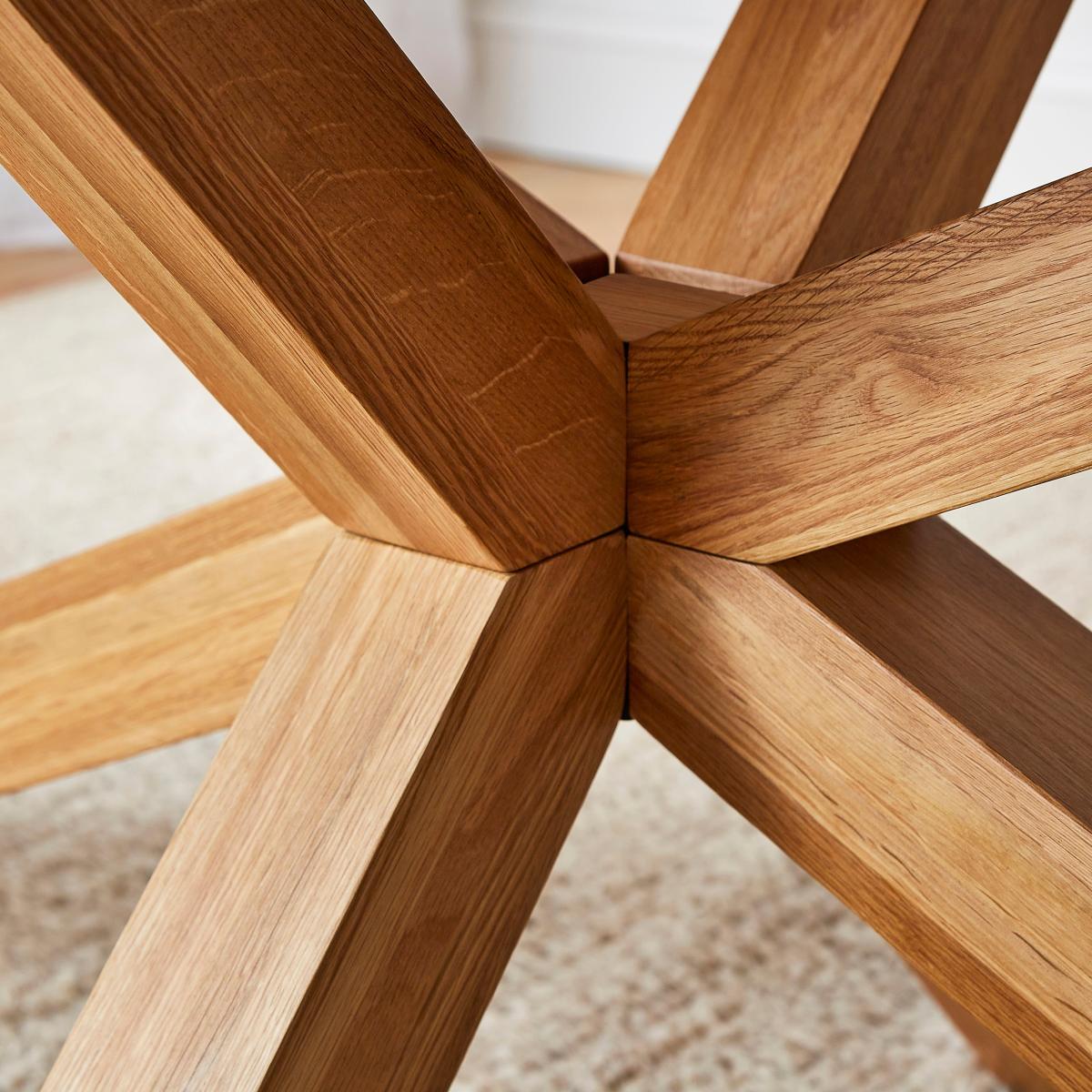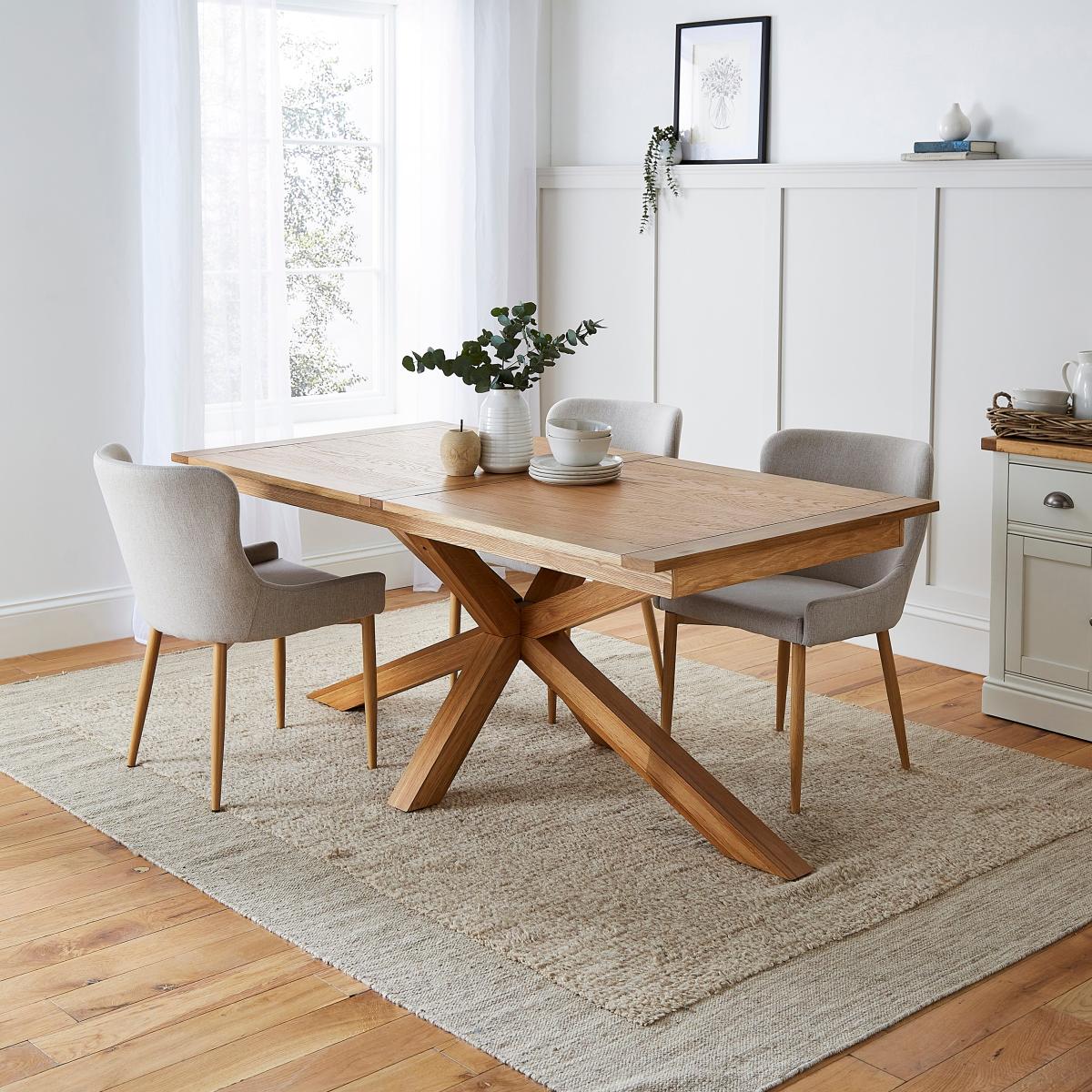 I’m a big fan of the Xavi extendable table - its warm oak finish and clean lines bring instant comfort, while the easy-glide extension turns a six-seater into an eight-seater in seconds, making it perfect for both family meals and weekend dinners. It sits beautifully in Scandi, modern farmhouse or pared-back contemporary interiors, where natural materials and neutral palettes are key. For styling, keep your centrepiece simple: a linen runner, a mix of ceramic vases with fresh greenery and a few clusters of tapered candles. Woven placemats and folded linen napkins add texture, and pairing the table with slim-legged wooden or softly upholstered chairs will enhance its relaxed, cohesive look. A single pendant light hung centrally will finish the scheme without overpowering the table’s natural charm.