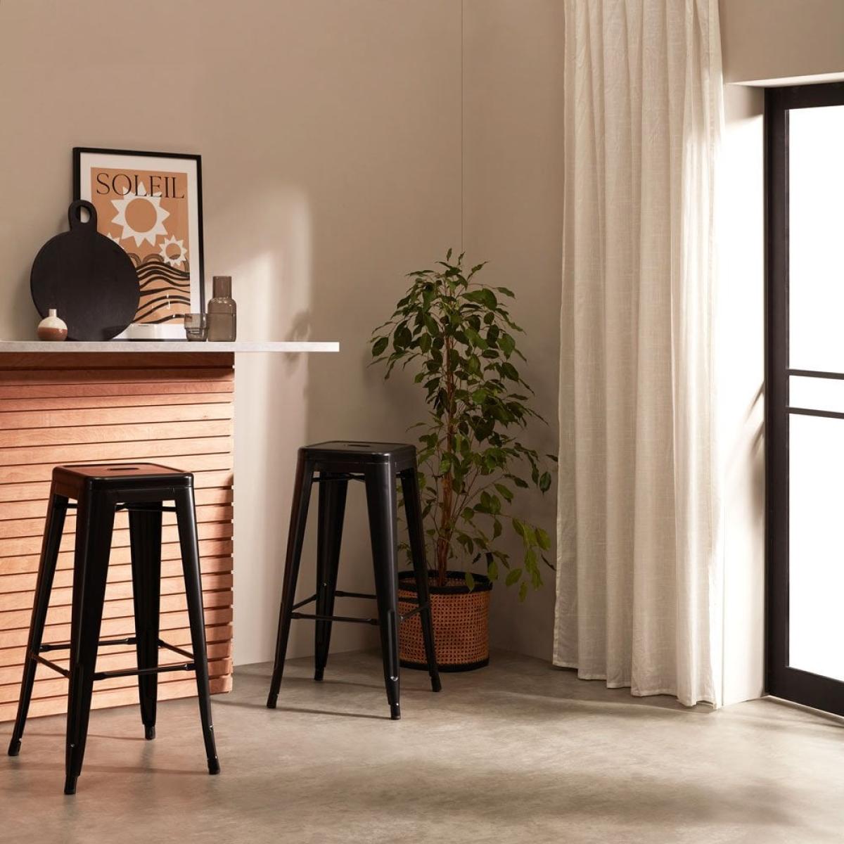 I’m a fan of this Tolix-style bar stool in matte black because its clean lines and sturdy metal finish suit everything from industrial-inspired kitchens to minimalist Scandi breakfast bars. It works particularly well against warm timber counters or raw concrete surfaces, and you can soften the look with a simple seat pad or small sheepskin drape. For a cohesive scheme, mix in a couple of stools in muted tones or pair them with pendant lights in black or aged brass, and leave a little space between each for a relaxed, airy feel.