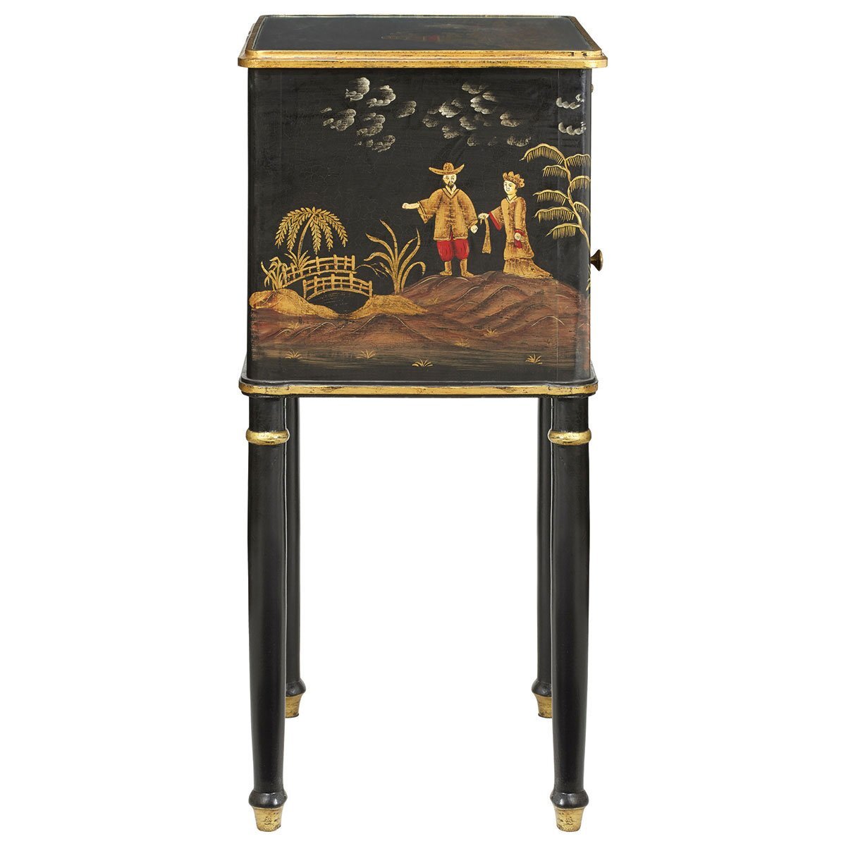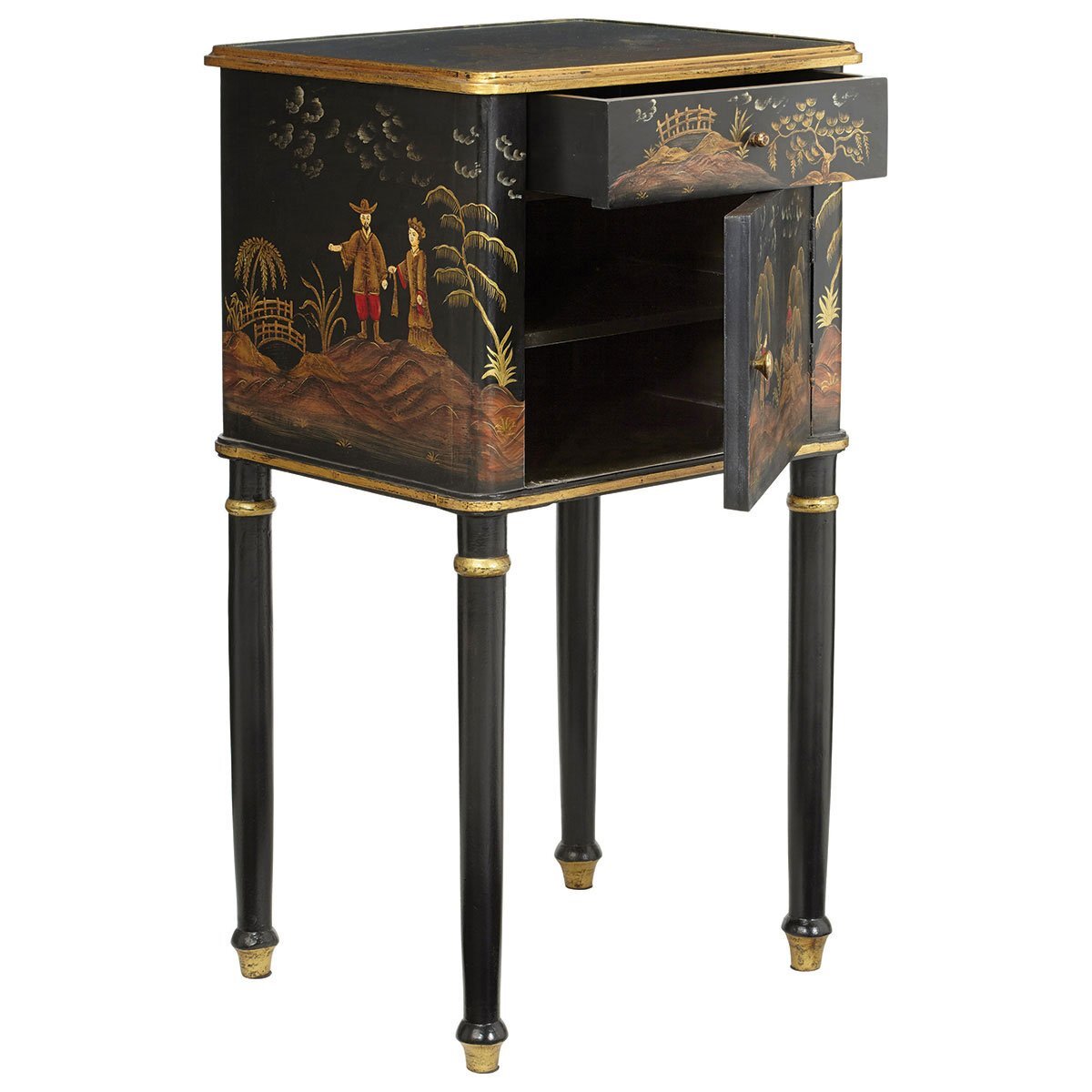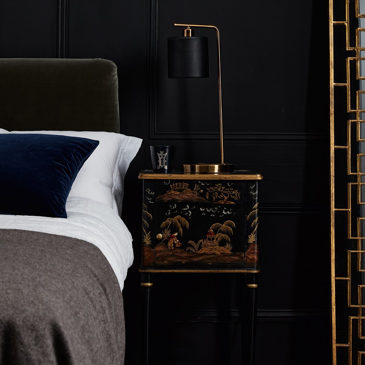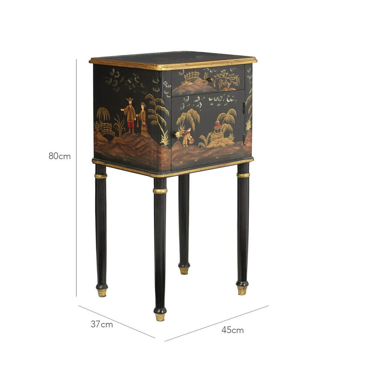A welcome addition to our Chinoiserie Collection, the neat Xin Bedside Cabinet is both wonderfully decorative and very useful. Look beyond the three sides and top surface, which are hand-painted with traditional Chinese scenes in gold leaf, and you will discover neat storage; a drawer and small cupboard with a fixed internal shelf. The glass top is a neat, practical way to ensure the decorative details stay pristine, too. Xin Bedside Table - Black
