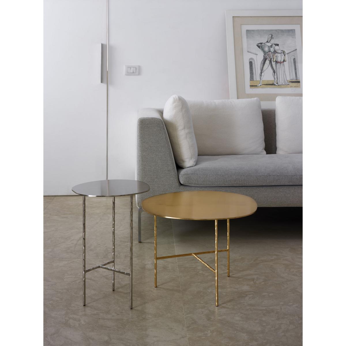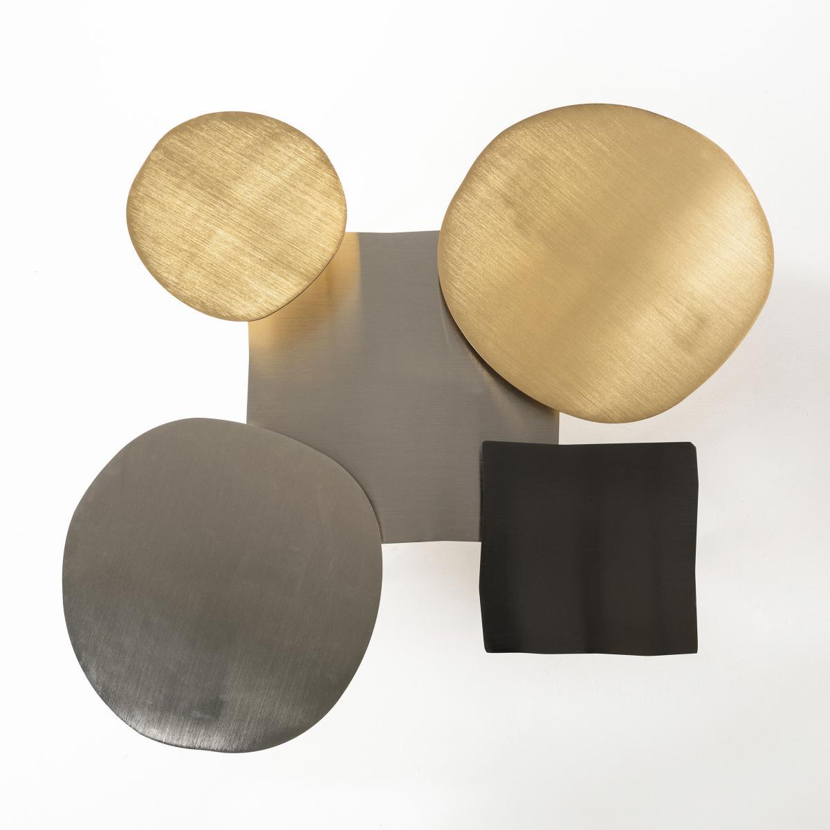 "These metal tables have a glamorous and industrial style, playing on the contrast between refined materials and raw shapes. The XXX table has a fine galvanised brushed nickel top. The asymmetric table top has uneven outlines that creates an exquisite hand-crafted feel. The wrought iron base presents a raw aspect: the irregular, imperfect surface gives this piece of furniture a special vibe. By reflecting all the random marks left by the tools used to make it, these pieces add a new twist to the industrial style. The very fine legs trace a clear and sleek line. This collection is displays real "material culture" and showcases their use. It awakens deeply buried emotions linked to the details on the object and its crafting, touching on the universal. Designer Lapo Ciatti: "I dreamt of table with a blurred outline, with undefined borders. A room that communicates something and transmits sensations, not limited to visual sensations. ".