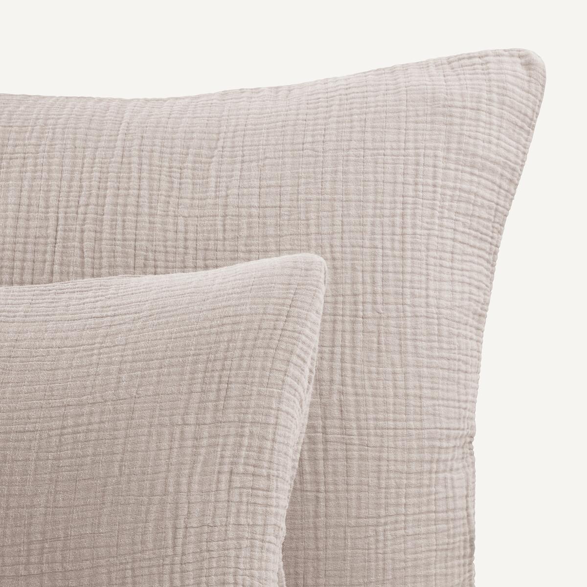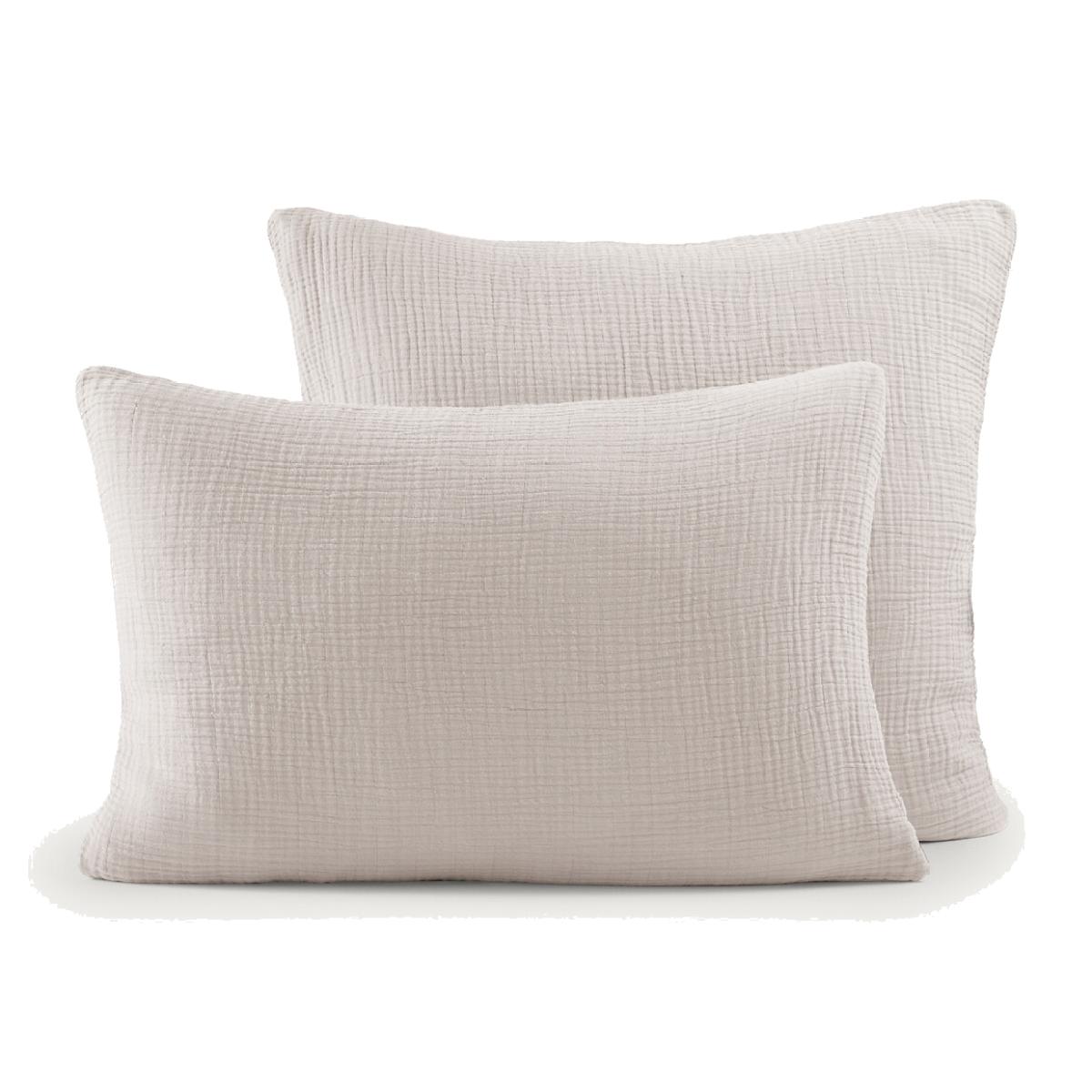 The Yafa pillowcase is made of cotton muslin. Made in Portugal.Product Details • 100% cotton • Organic cotton • Cotton muslin • 200 Thread Count: a common indicator for measuring the quality of fabric is the number of threads per cm². Different sensations are made possible thanks to the weaving and the number of threads present. Indeed, an optimal number of threads makes the bed linen particularly soft. Care Advice Follow our care tips to maintain the quality of your laundry • Machine washable at 40°C • Tumble dry at low temperature • Iron at low temperature • Do not dry clean. Dimensions • 50 x 70cm: Rectangular • 65 x 65cm: Square • MADE IN PORTUGAL. • Cotton from organic farming. Organic farming does not use any chemicals, pesticides, insecticides or GMOs. Produced with minimal impact on biodiversity. • OEKO-TEX® Standard 100. Standard 100 certification by OEKO-TEX® tests textile products for harmful substances via an independent, international label.