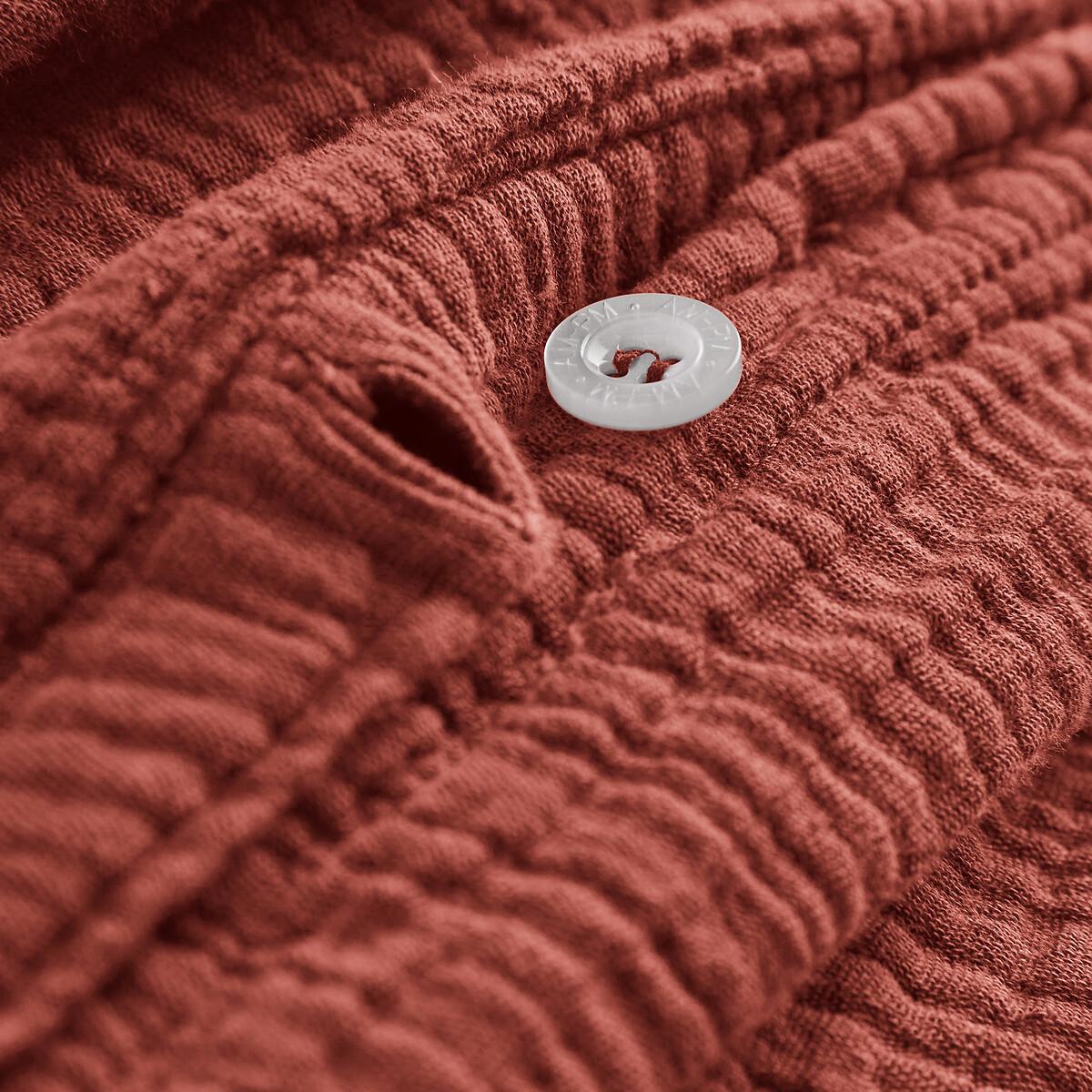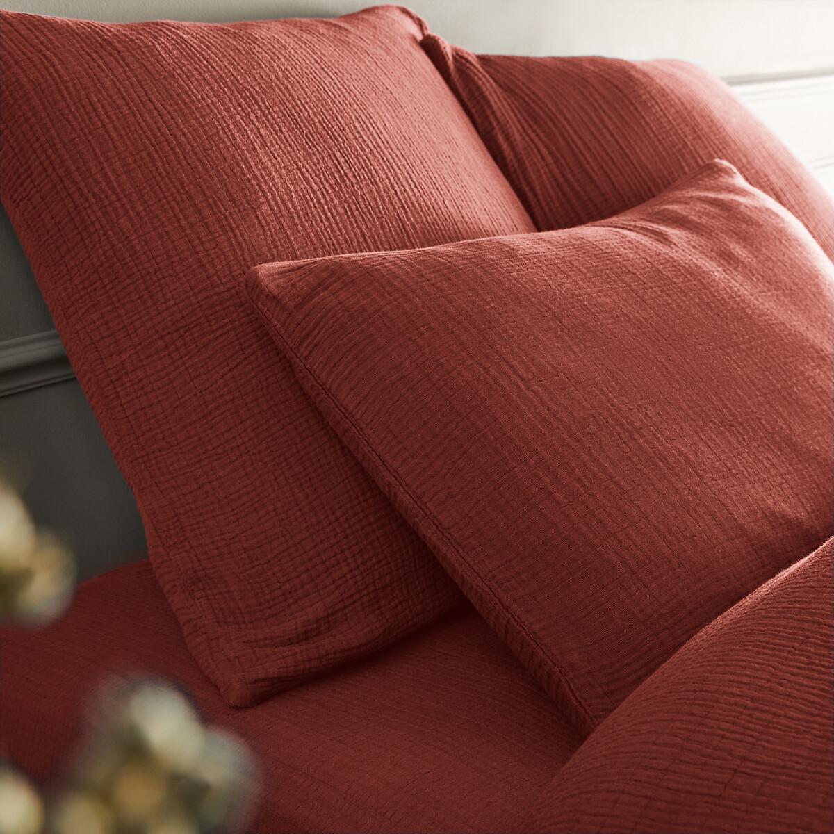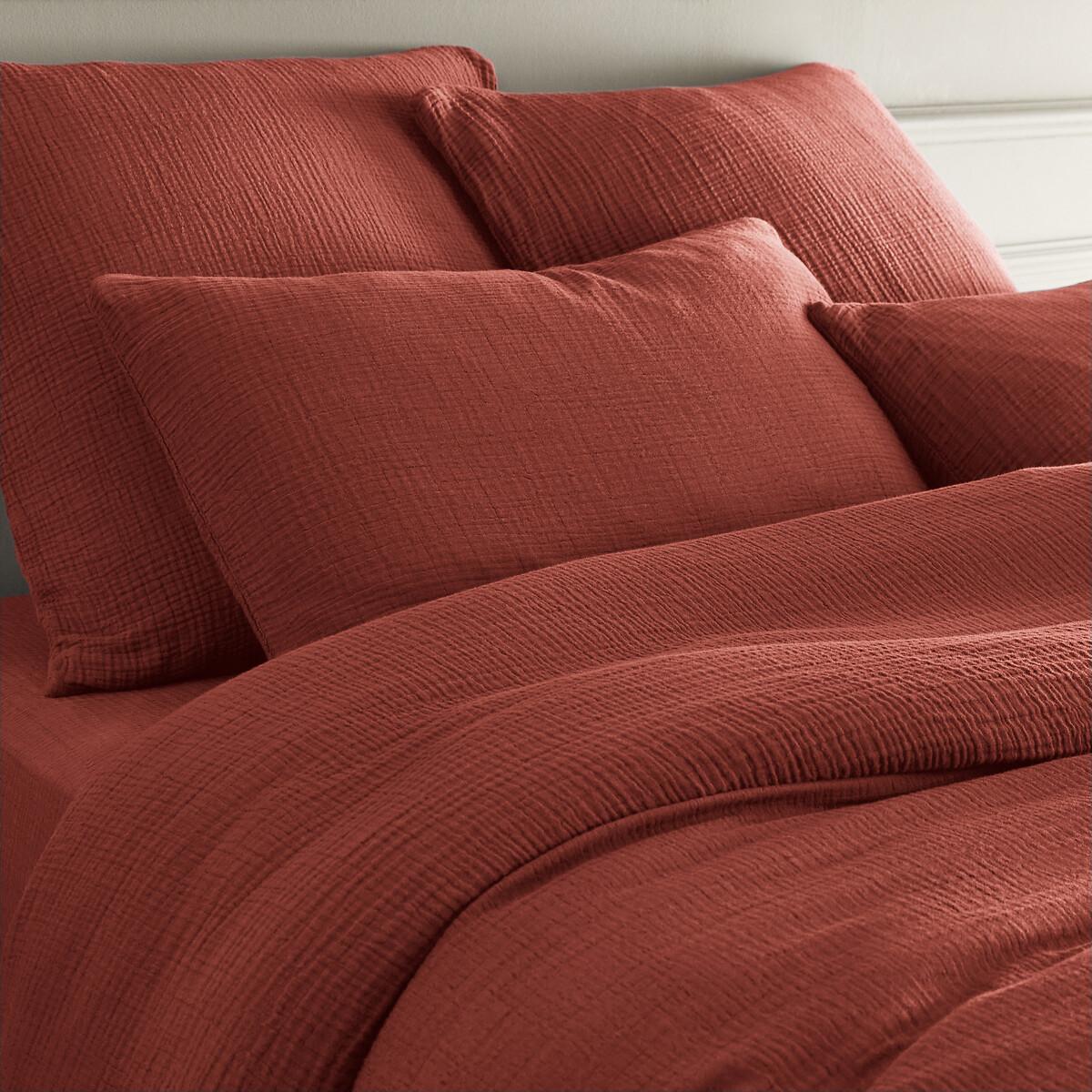 The Yafa duvet cover is made of cotton muslin. Made in Portugal.Product Details • 100% cotton • Organic cotton • Cotton muslin • 200 Thread Count: a common indicator for measuring the quality of fabric is the number of threads per cm². Different sensations are made possible thanks to the weaving and the number of threads present. Indeed, an optimal number of threads makes the bed linen particularly soft. • Straight buttoned hem Care Advice Follow our care tips to maintain the quality of your laundry • Machine washable at 40°C • Tumble dry at low temperature • Iron at low temperature • Do not dry clean. Dimensions • 140 x 200cm: Single • 200 x 200cm: Double • 240 x 220cm: King • 260 x 240cm: King • MADE IN PORTUGAL. • Cotton from organic farming. Organic farming does not use any chemicals, pesticides, insecticides or GMOs. Produced with minimal impact on biodiversity. • OEKO-TEX® Standard 100. Standard 100 certification by OEKO-TEX® tests textile products for harmful substances via an independent, international label.