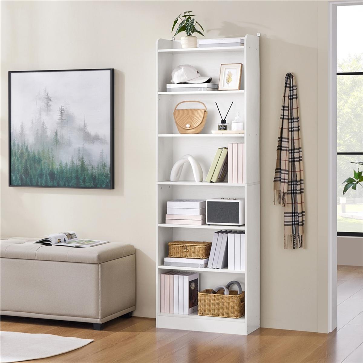 For book enthusiasts with limited space, this tall 7-layer bookshelf is an ideal option. Its slim design fits perfectly into small corners, featuring two adjustable shelves for your expanding collection of novels. The open-top shelf accommodates taller books or decorative items, while the raised base facilitates cleaning, merging classic style with functional storage.