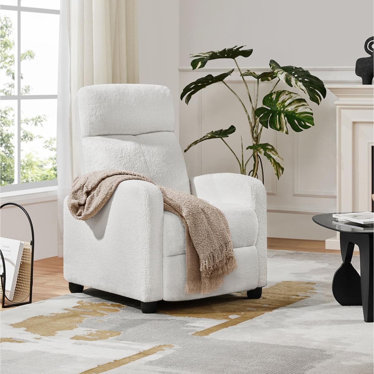 An ideal combination of comfort and style - this boucle recliner is crafted with a sturdy engineered wood frame, and resilient pocket springs, easily supporting up to 120 kg. Adjust the backrest and footrest to your preference - sit upright, elevate your legs, or lay flat. A gentle push on the backrest effortlessly lifts the footrest. This recliner is here to pamper you and provide the ultimate seating experience. Whether you place it in your living room, bedroom, home theater, office, or any other space, this reclining sofa is a fantastic addition that will elevate your space to new levels of comfort and sophistication.