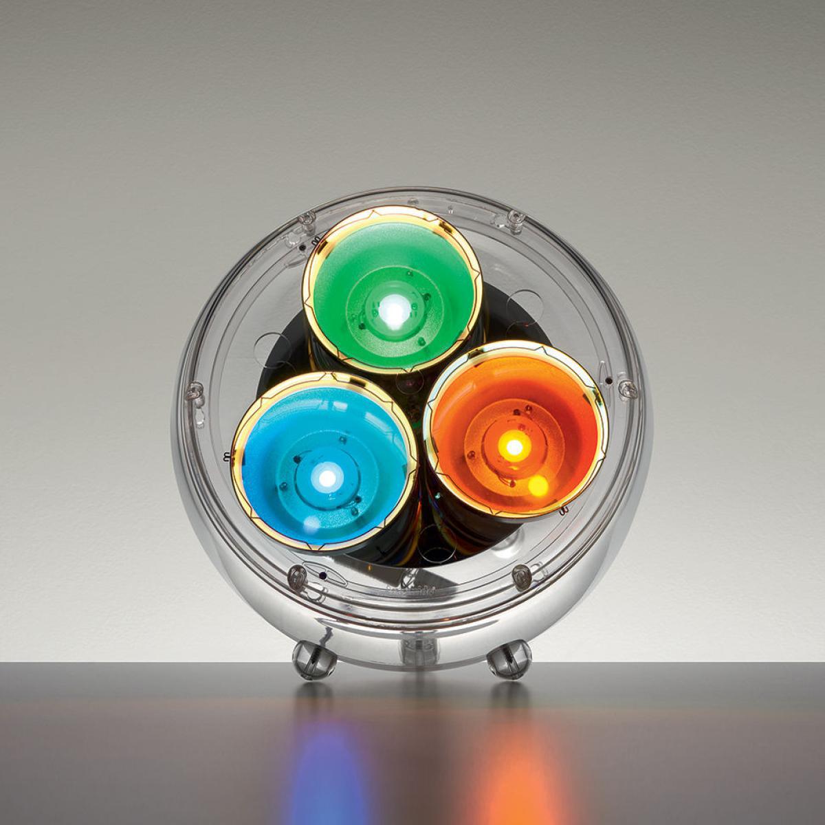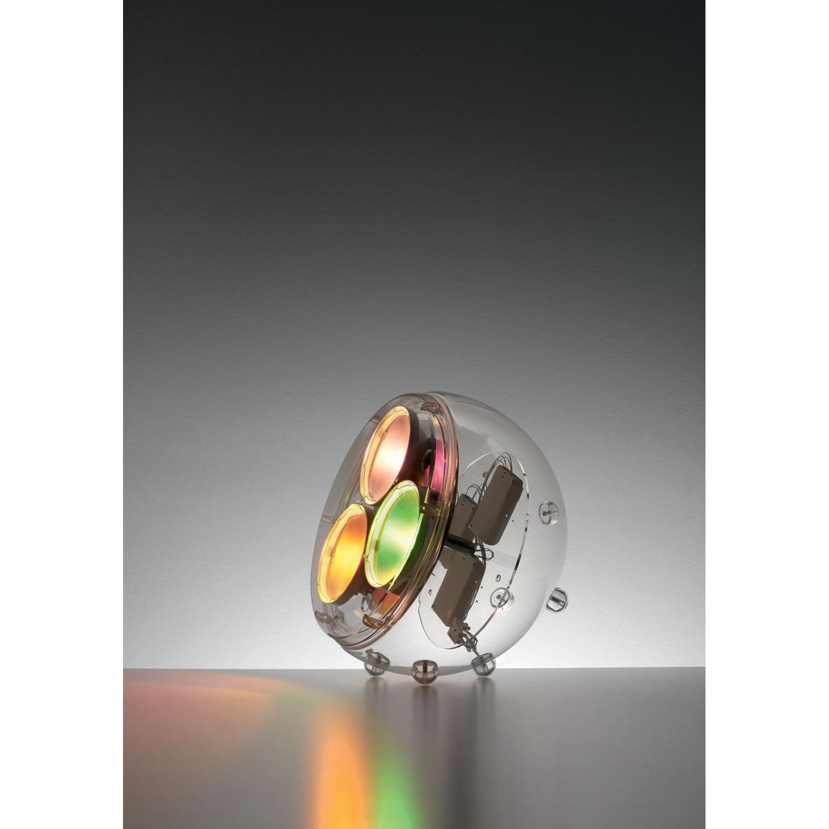 Light as a source of well-being. Artemide offers us a new way of using light based on the positive influences that colours have on the human being and its psychic well-being. Thanks to a true technological revolution, the Yang lamp reproduces the different shades of natural light and allows everyone to choose their own light, according to their activities and moods. Thanks to its three coloured dichroic filters (red, blue and green), Yang produces astonishing light and colour effects (more than 16 million possible colours, including white). You can adjust different light settings: colour, temperature, wavelength, intensity to obtain several variations of white or coloured light, from very hot to very cold. Thus, Yang creates a range of moods by using several shades of light. You can reproduce the white light at the edge of orange, corresponding to dawn or sunset, or the strongly bluish white light typical of a cloudy summer’s day. Light becomes an active instrument that can help you in your moments of relaxation, concentration or creativity. A light that adapts to your work environment needs and your mood! Yang is an original floor lamp. The absolute transparency of the polycarbonate structure leaves all its internal system visible, in order to communicate a very technological idea of the product. The spherical shape and six feet let you place the lamp in different positions and direct the light where you want. The lighting can be controlled by bluetooth using a smartphone app (free to download on Apple Store & Google play). By using the Artemide app, you can turn the light on and off, decrease the intensity of the lamp, create an infinity of light scenarios for your home.