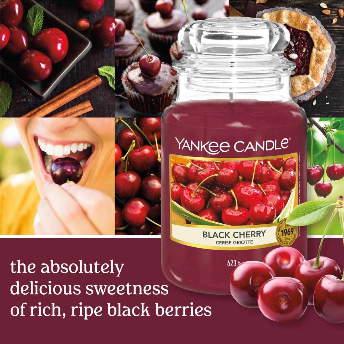 * Black Cherry Scented Candle* Original large jar* Yankee Candle brand* 150 hours burn time* Made with premium ingredients* Natural-fibre wick Immerse yourself in a deliciously fruity fragrance for up to 150 hours burn time with Yankee Candle’s Black Cherry Scented candle in their iconic original large jar size. Capturing the delicious sweetness of rich, ripe black cherries, this fragrance features top notes of cherry and almond, mid notes of cherry cinnamon and sit upon a base of sweet cherry for a full flavoured scent. Designed to create a welcoming aroma for family and house guests, this sweet scent is made with the finest ingredients, premium-grade paraffin wax, and natural-fibre wicks are selected for each fragrance to ensure the best possible burn. Once you’ve come to the end of your candle experience and it’s empty, why not give it a new lease of life by cleaning the empty glass jar and upcycling it for effective storage full of style and practicality?**How to use and care for your Yankee Candle Large Jar Candle**Trim your wick to 3mm before each burn. Allow to pool - let the top layer of wax liquefy and pool to the edges to avoid tunnelling. When there is approximately 1cm of wax remaining, it is time to stop using your candle. Extinguish the candle when 1cm of wax remains and recycle it according to your local recycling centre's guidance.