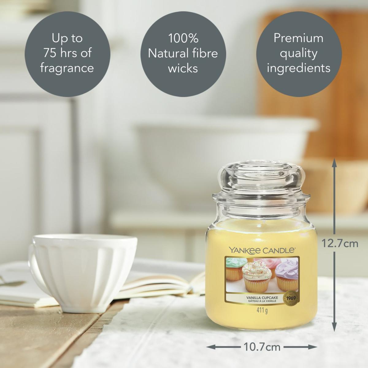 The rich, creamy aroma of vanilla cupcakes with hints of lemon and lots of buttery icing. Made with top notes of vanilla icing, melted sugar, mid with cake batter, chocolate and base with cocoa, vanilla bean. Our medium Jar Candle provides up to 75 hours of soothing fragrance designed to create a welcoming home, adding a pleasant aroma to any space. Vanilla Cupcake scent. Paraffin wax. Approximate burn time 75 hours. Size H12.7, W10.7, D10.7cm. Diameter 19.8cm.