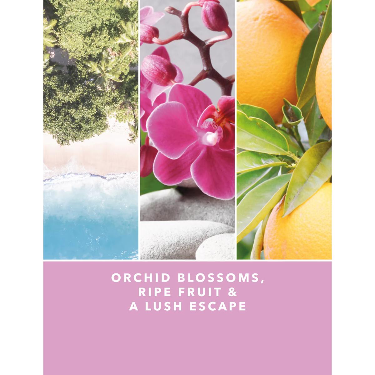 Bring a signature scent to your home with this vibrant Wild Orchid Yankee Candle. It's presented in a sleek medium-sized glass jar for an iconic look and features two natural fibre wicks to enhance the fragrance. The premium soy wax blends notes of fresh florals with sweet ripe fruit, creating a tropical ambience in your interior. Fragrance Notes:Top: Sunny Ozone, Mandarin Blossom, Bergamot, Palm Leaf. Mid: Wild Orchid, Hibiscus, Strawberry Nectar, Midnight Jasmine, Banana Flower. Base: Fruity Musk, Sandalwood, White Amber.