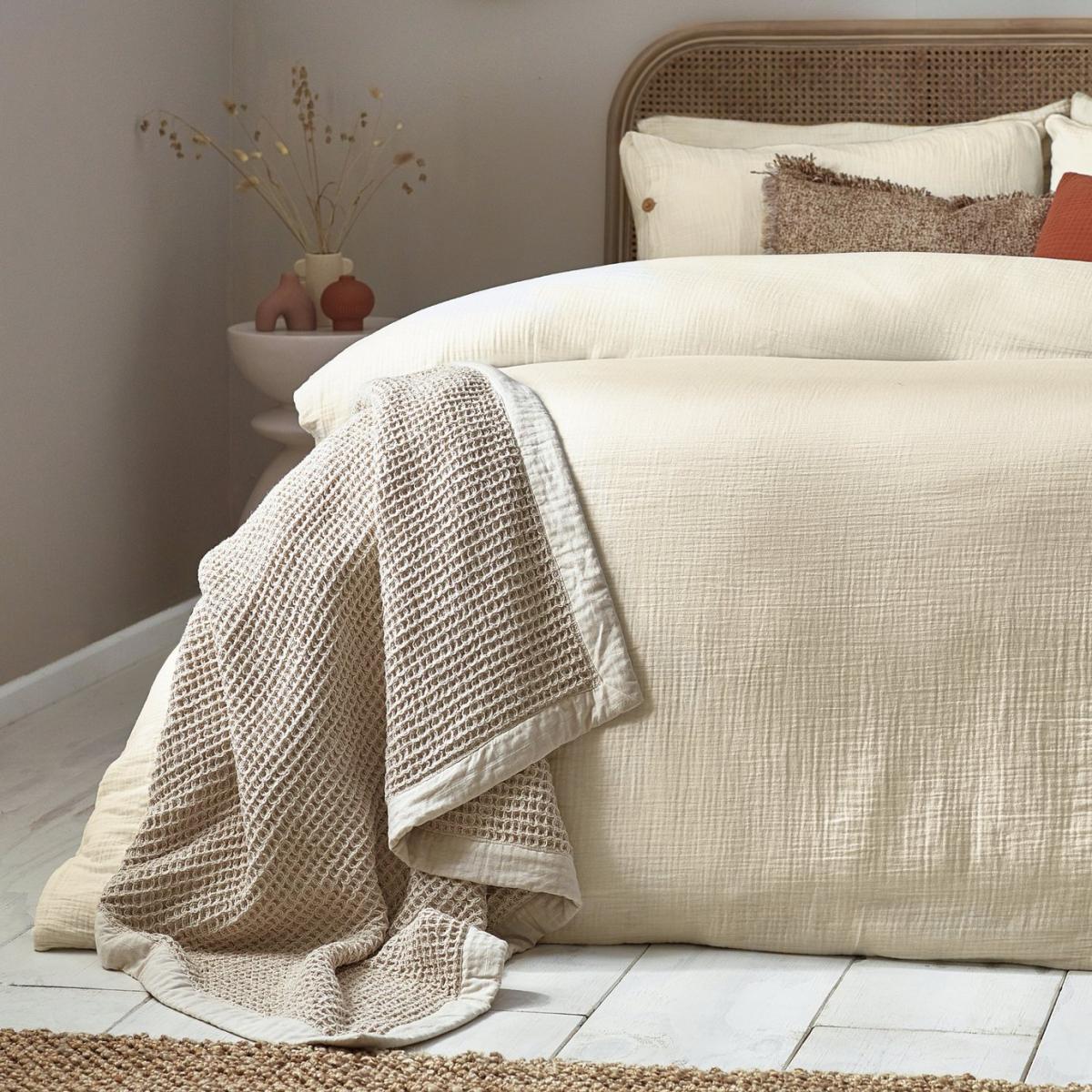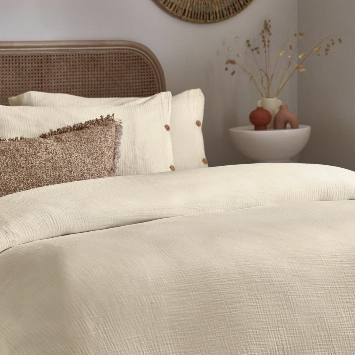 Inspired by timeless classic fabrics, the Lark duvet cover set is made from ultra-soft double-layer muslin cotton fabric. Available in a range of pastel tones, this bedding is complete with a wooden button closure. The cosy crinkle texture is perfect for bringing a relaxed, stylish feel to your bedroom. Cool and breathable in the summer months and snuggly and warm in the winter, muslin is used on both sides for an understated yet modern look. This product is certified by OEKO-TEX, showing it has been sustainably made. 100% cotton. 200 thread count. Set includes 1 duvet cover and 1 pillowcase. Bed size: single. Length 200cm, Width 135cm. Normal confection edging detail. Buttons for fastening. Standard pillowcase (s). Pillowcase length 75cm, Width 50cm. Machine washable. Suitable for tumble drying.