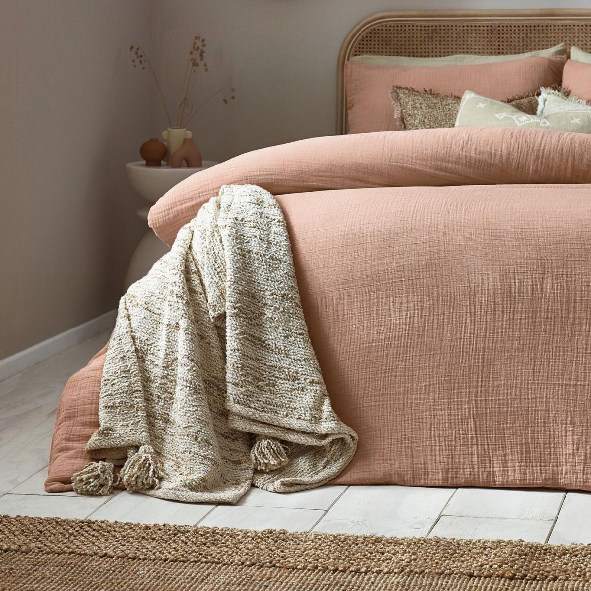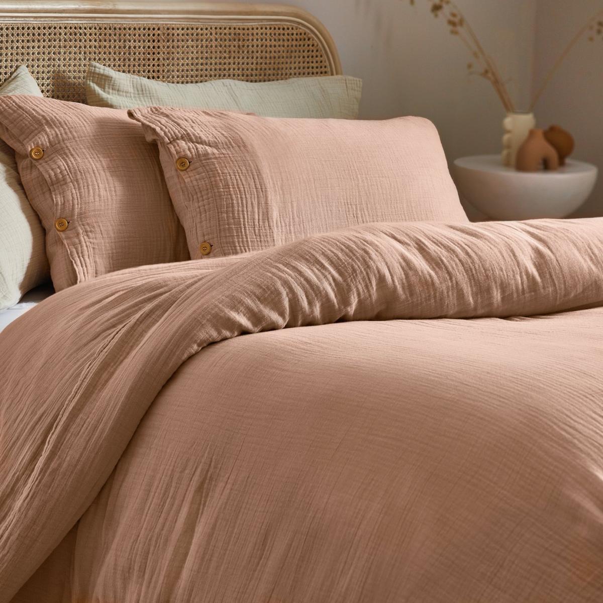 Inspired by timeless classic fabrics, the Lark duvet cover set is made from ultra-soft double-layer muslin cotton fabric. Available in a range of pastel tones, this bedding is complete with a wooden button closure. The cosy crinkle texture is perfect for bringing a relaxed, stylish feel to your bedroom. Cool and breathable in the summer months and snuggly and warm in the winter, muslin is used on both sides for an understated yet modern look. This product is certified by OEKO-TEX, showing it has been sustainably made. 100% Cotton. 200 Thread Count. 100% cotton. 200 thread count. Set includes 1 duvet cover and 1 pillowcase. Bed size: single. Length 200cm, Width 135cm. Normal confection edging detail. Buttons for fastening. Standard pillowcase (s). Pillowcase length 75cm, Width 50cm. Machine washable. Suitable for tumble drying.