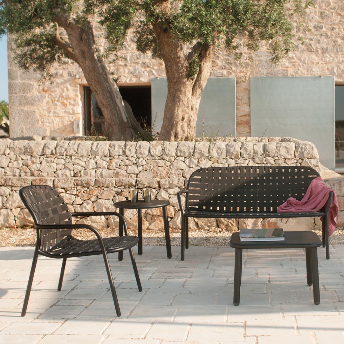 An urban, elegant feel for this low armchair which ensures optimal comfort. Flexible and ergonomic, the seat is made up of woven elastic strips which hug your body shape. Attention has been paid to every last detail: as such, the attachment system of elastic strips to the aluminium structure is completely invisible. This stackable armchair is ultra-light: barely 3.6 kg! It will look sensational inside and out.