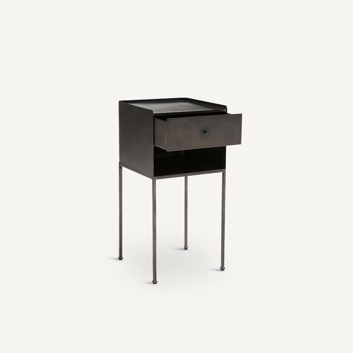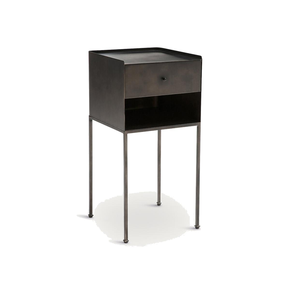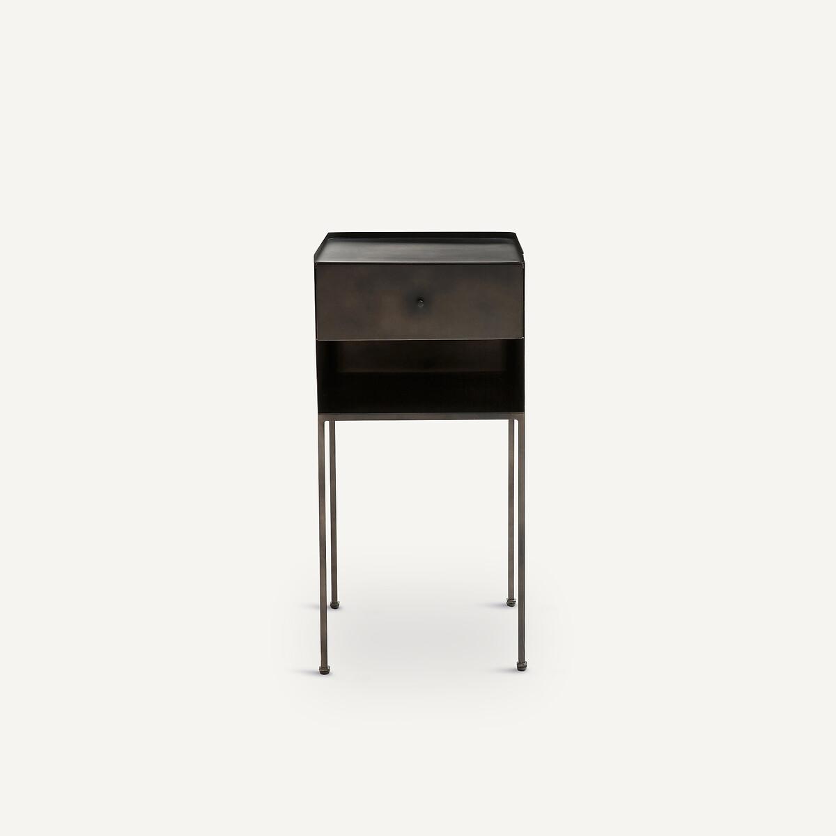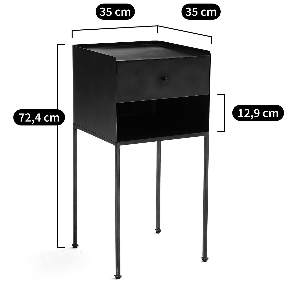 The Yazdan bedside table. This ultra-modern bedside table is crafted from metal for an industrial, contemporary style. Product Details • Aged effect steel • "Bowl" tabletop so that objects placed on it do not fall off • 1 drawer • 1 compartment • Supplied ready assembled Dimensions • Total: L35 x H72.4 x D35cm • Useable drawer dimensions :L31.6 x H13.8 x D33.2cm • Dimensions of compartment : L31.6 x H12.9 x D33.2cm Parcel Dimensions • L43 x H79 x D43cm • 20.5kg