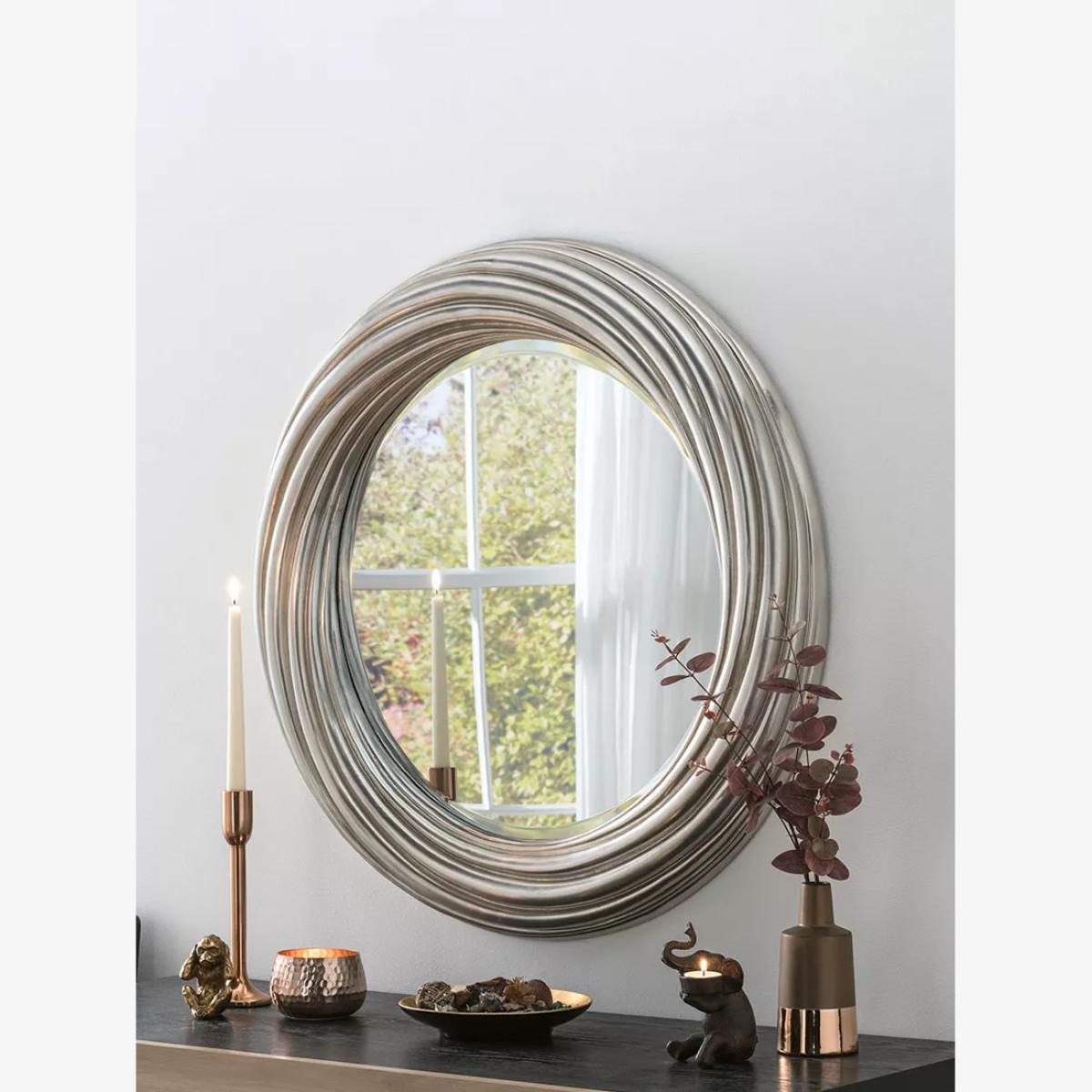 I love this round wall mirror for its sleek, contemporary design and versatile size, making it a statement piece in both modern and eclectic interiors. Its silver swirl frame adds texture and visual interest without overwhelming the space. It works particularly well in feature walls, hallways, or above a console table, where it can reflect light and create a sense of openness. Practically, it's great to position opposite a window to maximise natural light, and pairing it with metallic accessories or soft furnishings can enhance a cohesive look. Keep the surrounding decor minimal to let the mirror shine, or use it as a focal point in a more layered, styled setting.