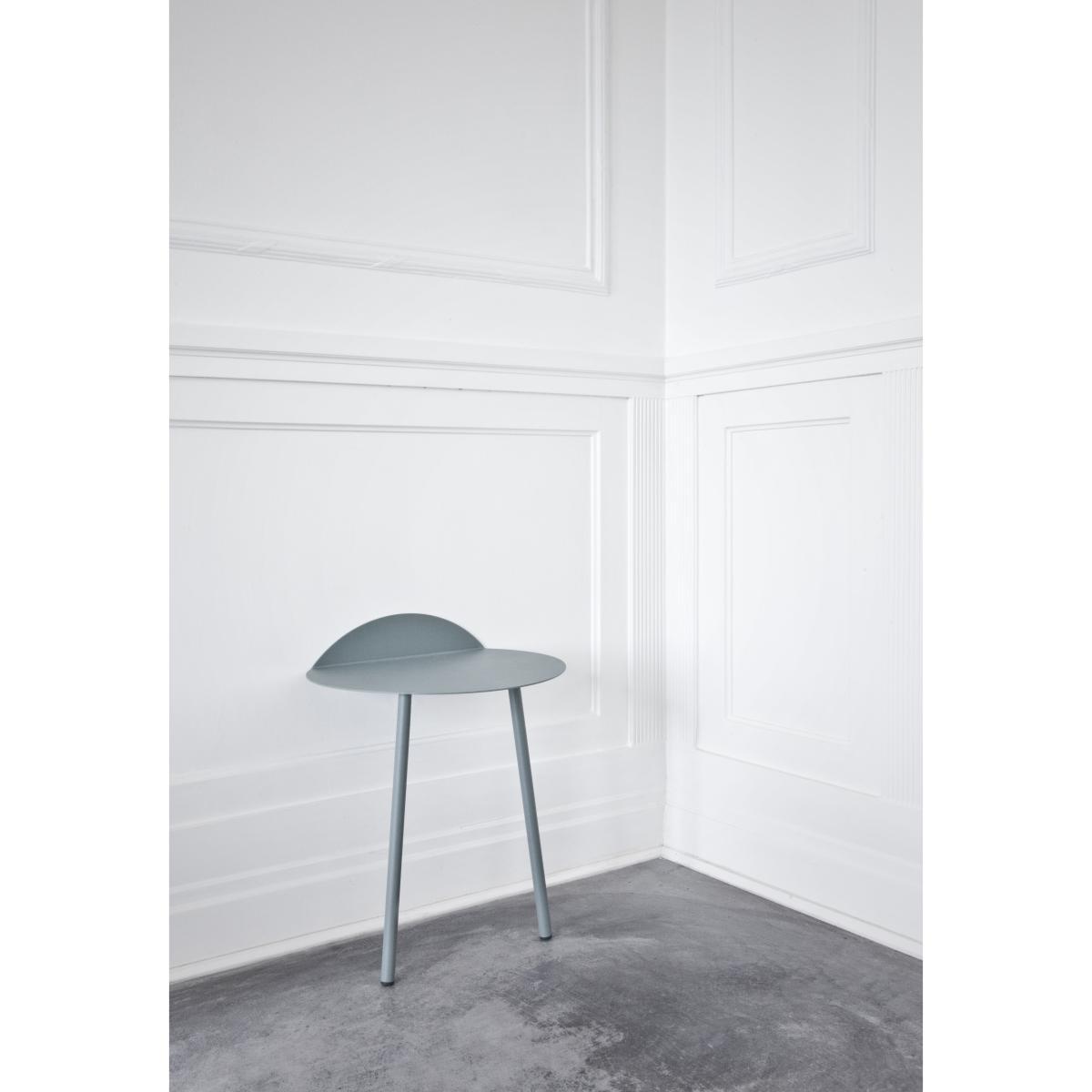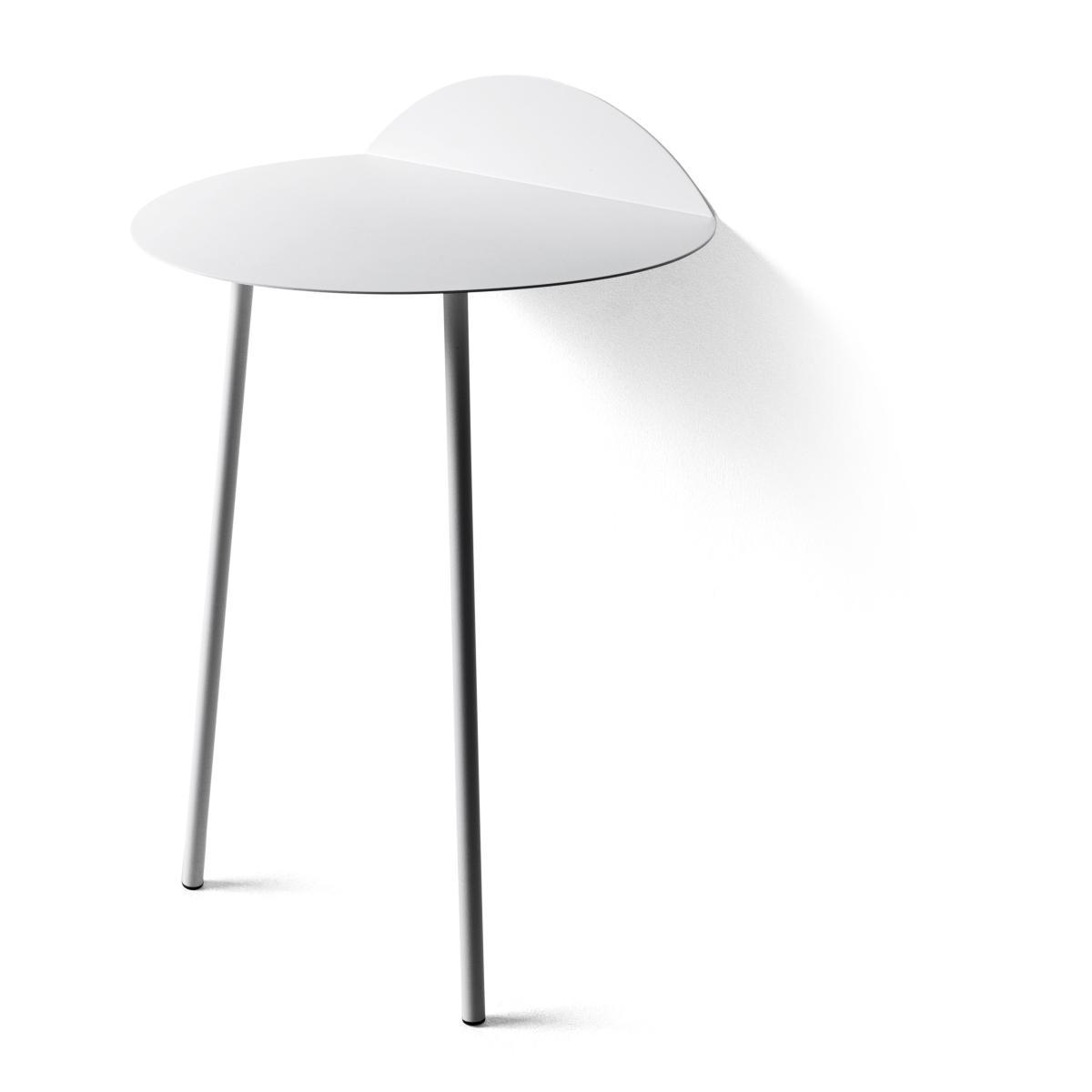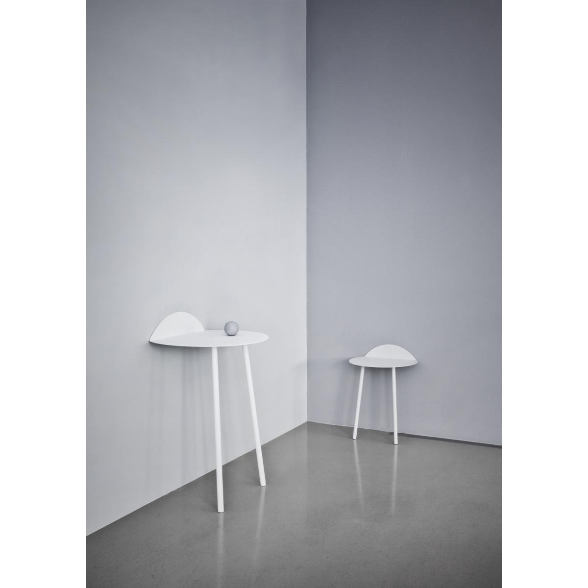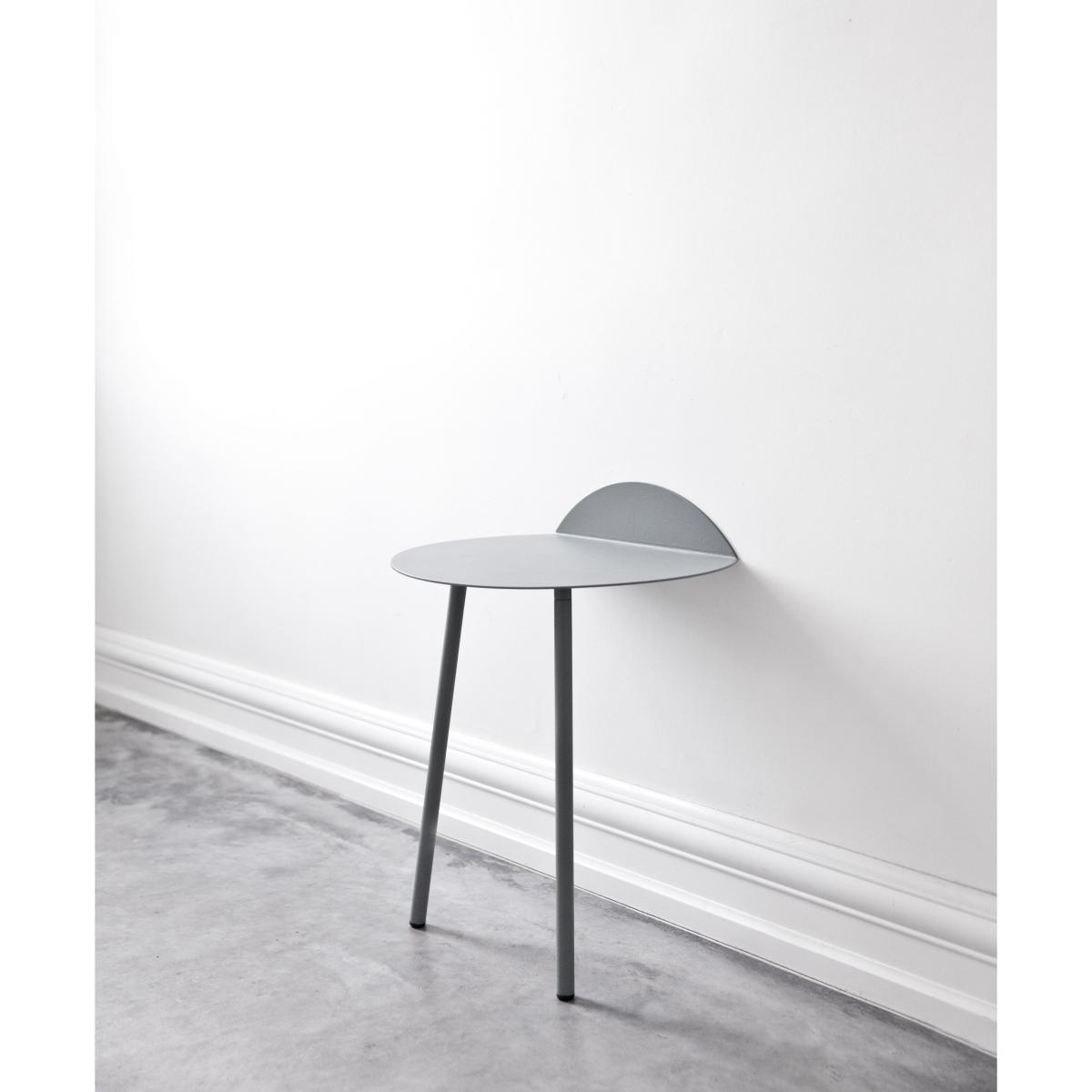 Yeh Wall Table is designed by Taiwan-based designer, Kenyon Yeh. He found the inspiration to this mobile side-table after observing a cheerleading practise at a neighbouring school in his hometown. Kenyon Yeh: "I was walking to my studio and passed a school where two students were practising balance and strength for their cheerleading routines. The guy was with his back resting against the wall, in a sitting position without a chair, while the girl was standing on his thighs with her arms stretched out". The scene inspired Kenyon to design a minimalistic table with clean lines standing on only two legs. To compensate the two missing legs, a part of the thin tabletop is bent upwards in a 90-degree angle against the wall. Two thin and slightly angled tubular steel legs give additional stability. No other fixtures are needed for the table to support what's placed on top of it. "Yeh Wall Table mimics a person in sitting position with the back resting against the wall and the legs firmly placed on the ground. If muscles and bone structure carries the person, coated steel is what gives the table necessary stability. These characteristics that give an imaginative floating sensation and added value to the design", says to Kenyon. Yeh Wall Table is a functional design that can be used as a side-table for books, plants, a table lamp or small objects. It's light, mobile and a clever solution for homes with limited spaces. It's presented in a high and a low version.