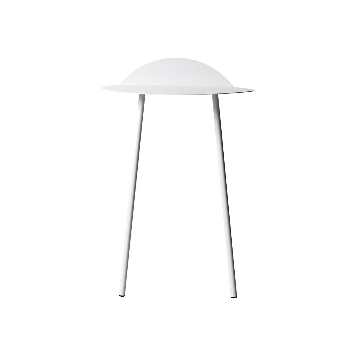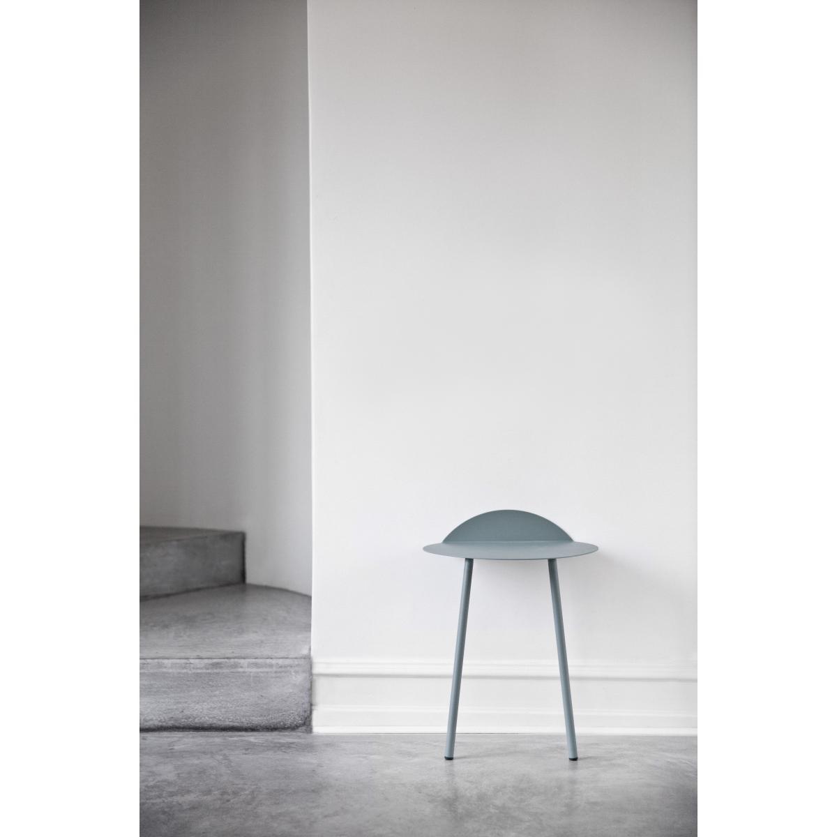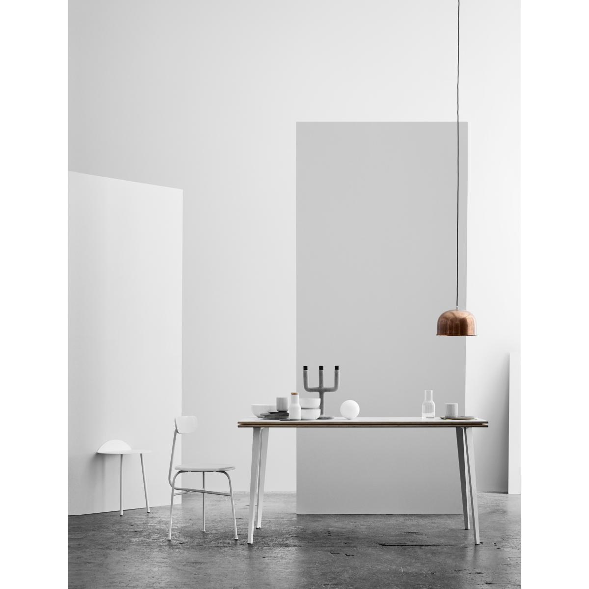 Yeh Wall Table is designed by Taiwan-based designer, Kenyon Yeh. He found the inspiration to this mobile side-table after observing a cheerleading practise at a neighbouring school in his hometown. Kenyon Yeh: "I was walking to my studio and passed a school where two students were practising balance and strength for their cheerleading routines. The guy was with his back resting against the wall, in a sitting position without a chair, while the girl was standing on his thighs with her arms stretched out". The scene inspired Kenyon to design a minimalistic table with clean lines standing on only two legs. To compensate the two missing legs, a part of the thin tabletop is bent upwards in a 90-degree angle against the wall. Two thin and slightly angled tubular steel legs give additional stability. No other fixtures are needed for the table to support what's placed on top of it. "Yeh Wall Table mimics a person in sitting position with the back resting against the wall and the legs firmly placed on the ground. If muscles and bone structure carries the person, coated steel is what gives the table necessary stability. These characteristics that give an imaginative floating sensation and added value to the design", says to Kenyon. Yeh Wall Table is a functional design that can be used as a side-table for books, plants, a table lamp or small objects. It's light, mobile and a clever solution for homes with limited spaces. It's presented in a high and a low version.