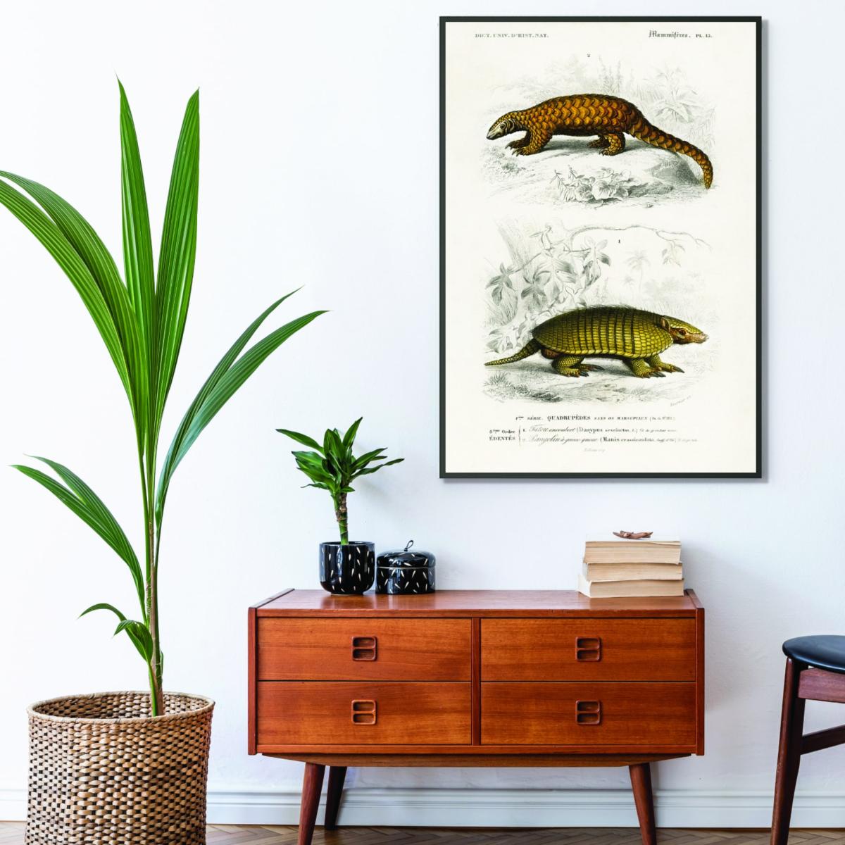 This print of the Yellow Armadillo and Indian Pangolin is a bold piece that lends itself well to eclectic or vintage-inspired interiors. I love it because of its detailed scientific aesthetic combined with the earthy colour palette, making it a versatile statement. It pairs nicely with natural materials and neutral tones, but can also stand out against darker, more dramatic walls. Practical styling tips include grouping it with other botanical or animal prints for a curated look, or using it as a focal point above a sideboard or on a gallery wall. It works equally well in living rooms, studies, or even hallways, adding a touch of curiosity and character wherever it’s placed.