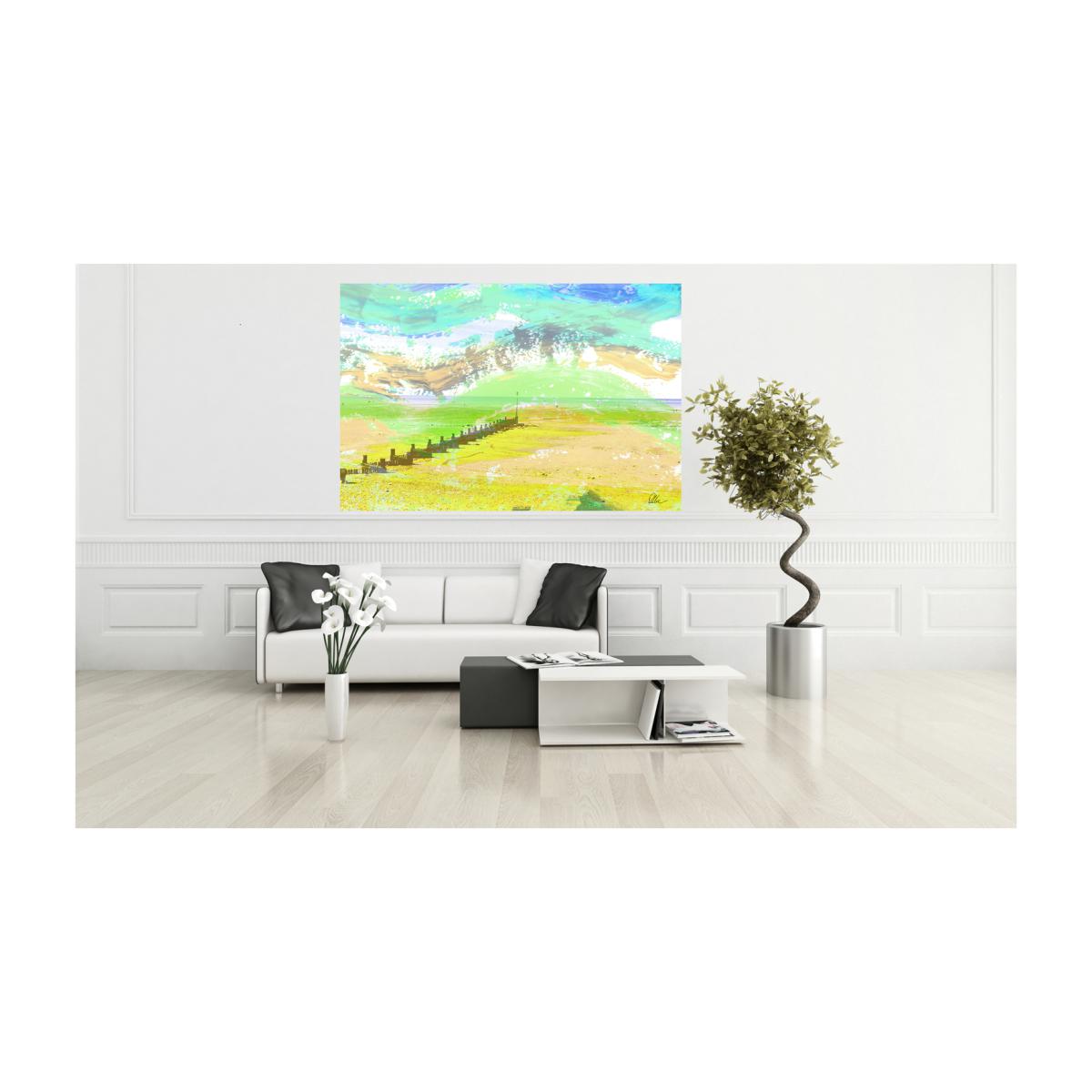 I love this beach-themed canvas for its vibrant yet soothing colour palette, making it a versatile piece to brighten up a living room or bedroom. It's especially effective in contemporary or coastal interiors, where the fresh yellows and blues can complement neutral tones or softer pastel shades. Practical styling tips include pairing it with minimalistic furniture to let the artwork be the focal point, or creating a relaxed, breezy atmosphere by adding natural textures like rattan or linen. Hanging it at eye level above a sofa or side table will make a striking statement without overwhelming the space. This piece is ideal for introducing colour and a sense of calm to a variety of interiors.