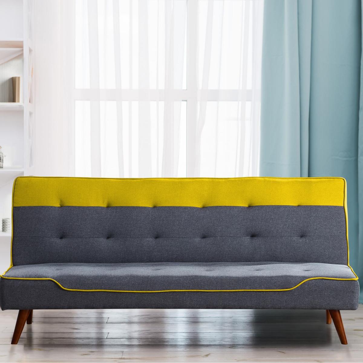 Stylish and practical, this modern fabric sofa bed is a perfect addition for any contemporary home and effortlessly converts from a comfortable 3 seater sofa into an ideal bed for two, perfect for when you have unexpected guests. Finely upholstered in a fashionable woven fabric with an elegant buttoned effect and finished in the two-tone contrasting fabrics make for a chic, modern look, this sofa is generously padded for a cosy night in. Available in Yellow. This versatile fold down sofa bed is made with a simple click-clack mechanism allowing it to transform into a comfortable bed in seconds. Simply pull the backrest forward until you hear the click and then lay it down into a flatbed. Convert into a sofa again by raising the backrest until it clicks into place. This sofa also has the added feature of a reclining setting for extra comfort.
