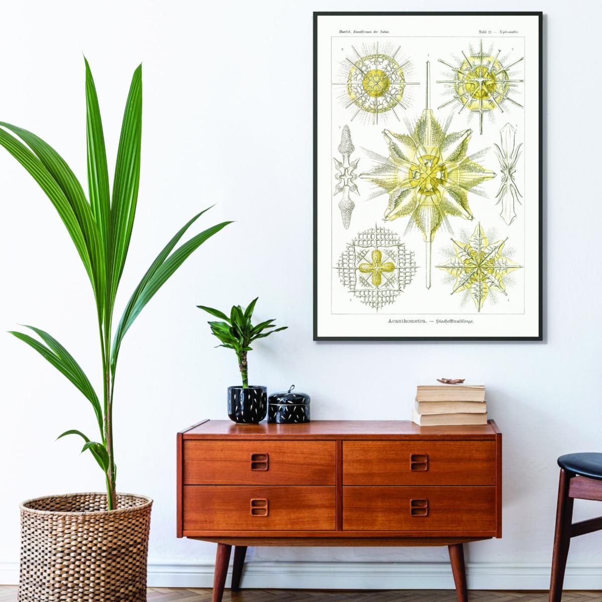 The yellow and orange acanthometra print is a striking piece that brings a vibrant yet scientific touch to any space. I love how its bold colours and detailed illustrations add both energy and sophistication, making it perfect for modern or eclectic interiors. It works particularly well above a neutral sofa or in a corridor to create visual interest. For styling, consider pairing it with minimalist furniture to let the artwork stand out, or combine with metallic accents for a contemporary edge. This piece can bring colour and intrigue to both living rooms and offices, making it a versatile statement that sparks curiosity.