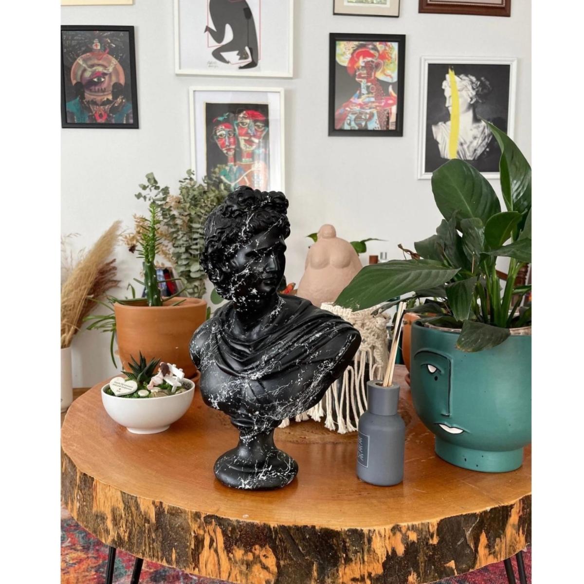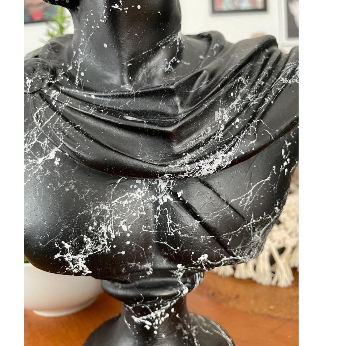 Apollo Reimagined: Monochrome Splatter is a striking 34 cm sculpture that combines classical art with modern design. This black Apollo bust is dramatically enhanced with white paint splatters, creating a bold contrast that symbolizes the merging of tradition and contemporary expression. The dynamic paint application adds movement and energy, transforming this timeless figure into a powerful statement piece for any space. Perfect for art lovers who appreciate a fusion of the classical and the avant-garde, this sculpture stands as a centerpiece in both minimalist and eclectic decor settings. Gently dust your sculpture with a soft, dry cloth or a feather duster.