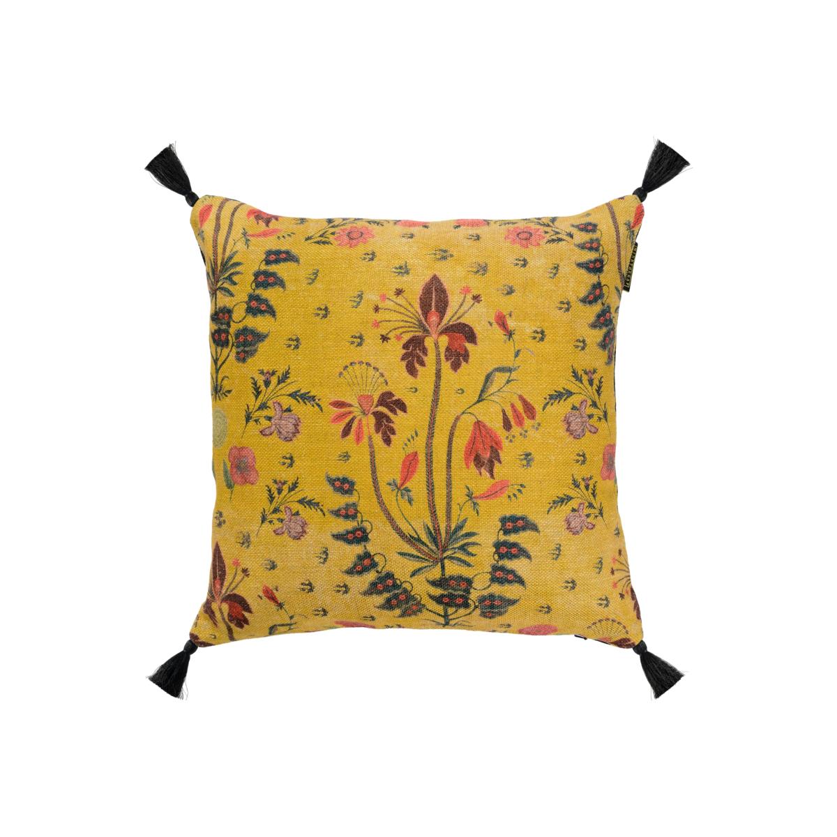 I love this cushion for its bold, lively colours and versatile design. The mix of yellow, orange, black, and ochre makes it an excellent statement piece that can instantly elevate both modern and eclectic interiors. It works particularly well in neutral or subdued schemes, providing a vibrant pop of colour, but can also be combined with other warm tones for a layered, cosy look. Style tip: pair it with textured fabrics like linen or velvet for added depth, and use it on a plain sofa or armchair to draw attention. Its square shape and detailed floral pattern make it a great choice for bringing character to both casual and sophisticated settings.
