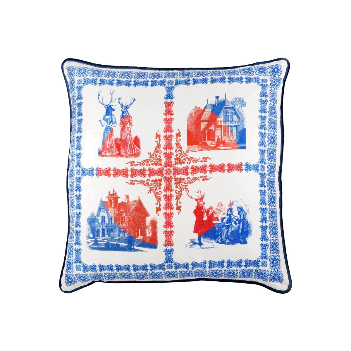 Silk twill and cotton velvet tile-print cushion. A tribute to Delftware, 16th century blue and white Dutch pottery inspired by Chinese porcelain, the Folk cushion features vintage storybook illustrations of mysterious mansions and hybrid animal-human creatures, bringing a sinister twist to the design. Made from silk twill and cotton velvet in a blue and white palette with an orange circle overlay in the centre, the Folk cushion will look fabulous mixed and matched with blue or white cushions. Composition: Silk twill front with cotton lining, cotton viscose velvet back, cotton viscose velvet piping Digitally printed front Includes feather pad Removable cover Discreet zip closure Dry clean only
