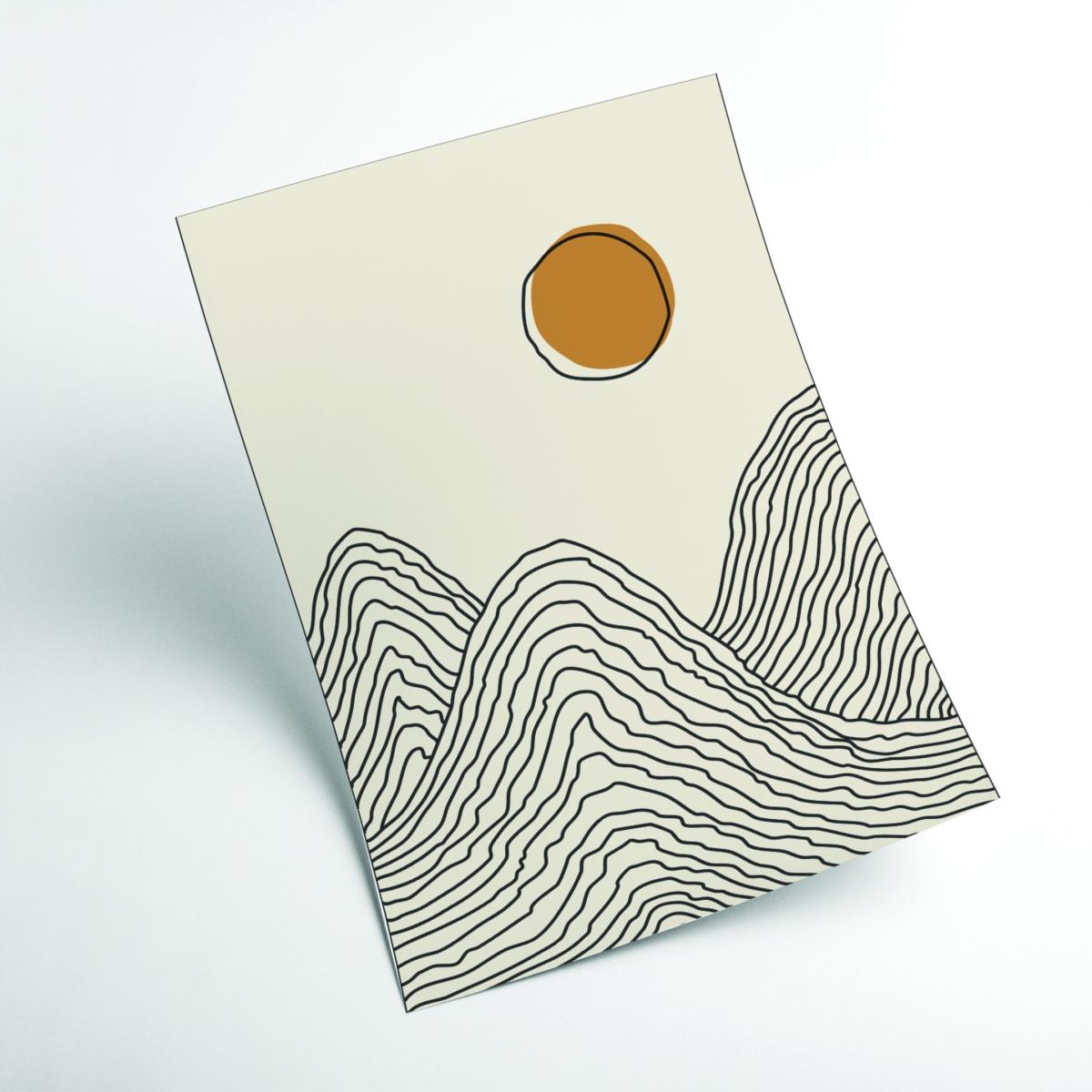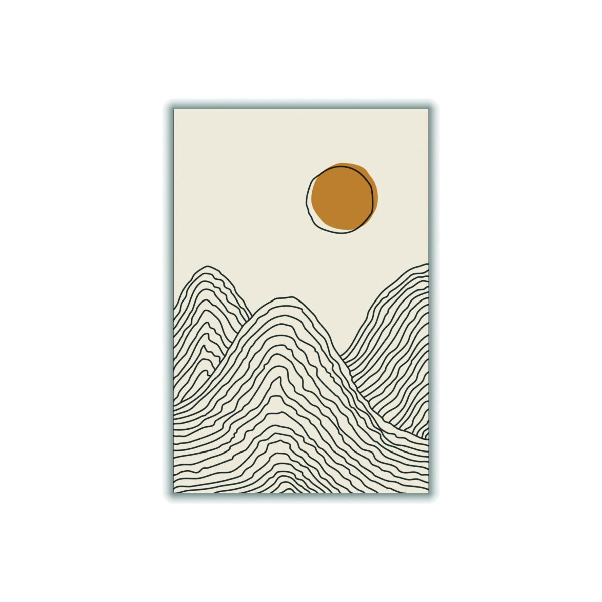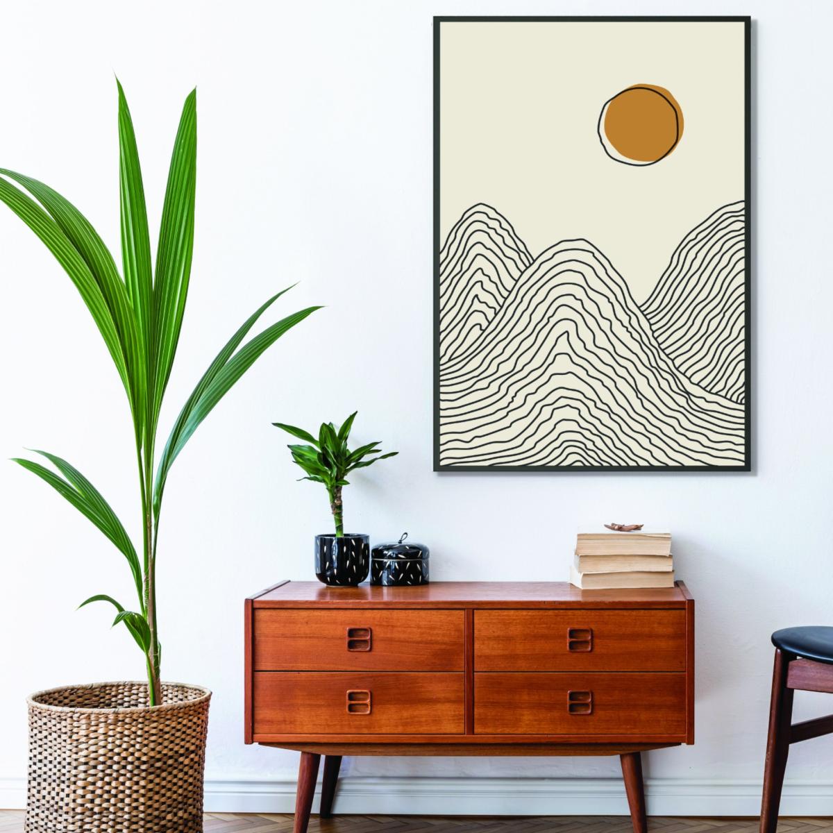 I really like this piece because its bold yet minimalist approach makes it versatile for various interiors. The warm yellows and oranges evoke a cosy, sunset vibe that works particularly well in boho, eclectic, or modern spaces, adding warmth and personality without overwhelming the room. It pairs beautifully with natural textures like rattan, woven throws, and earthy palettes. For styling, consider placing it above a neutral sofa or a rustic sideboard to create a focal point. Alternatively, it can work as part of a gallery wall with other artworks or prints in similar colour schemes for a more layered look. The A2 size makes it perfect for adding impact without dominating the space, making it a flexible addition to both larger living rooms and bedrooms.