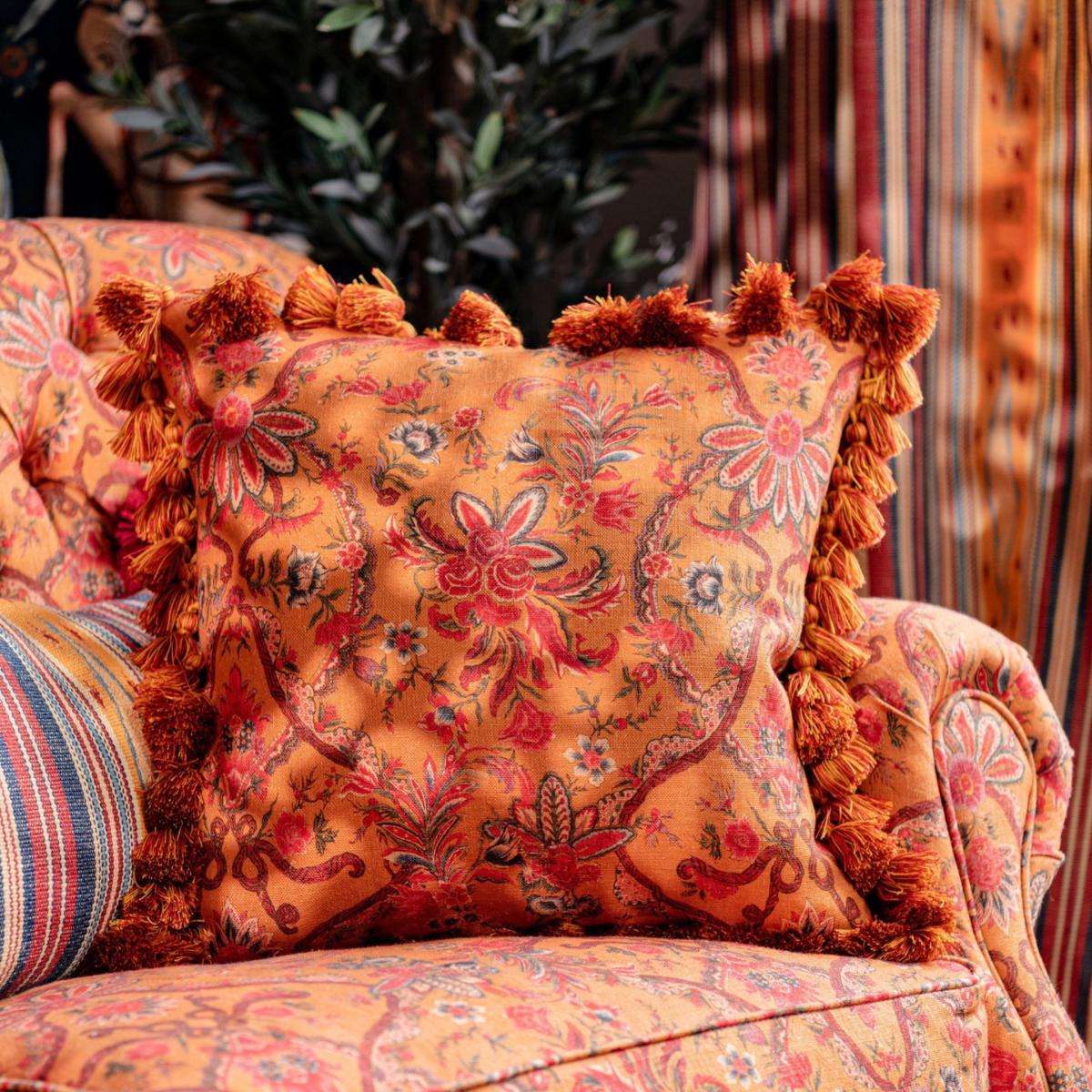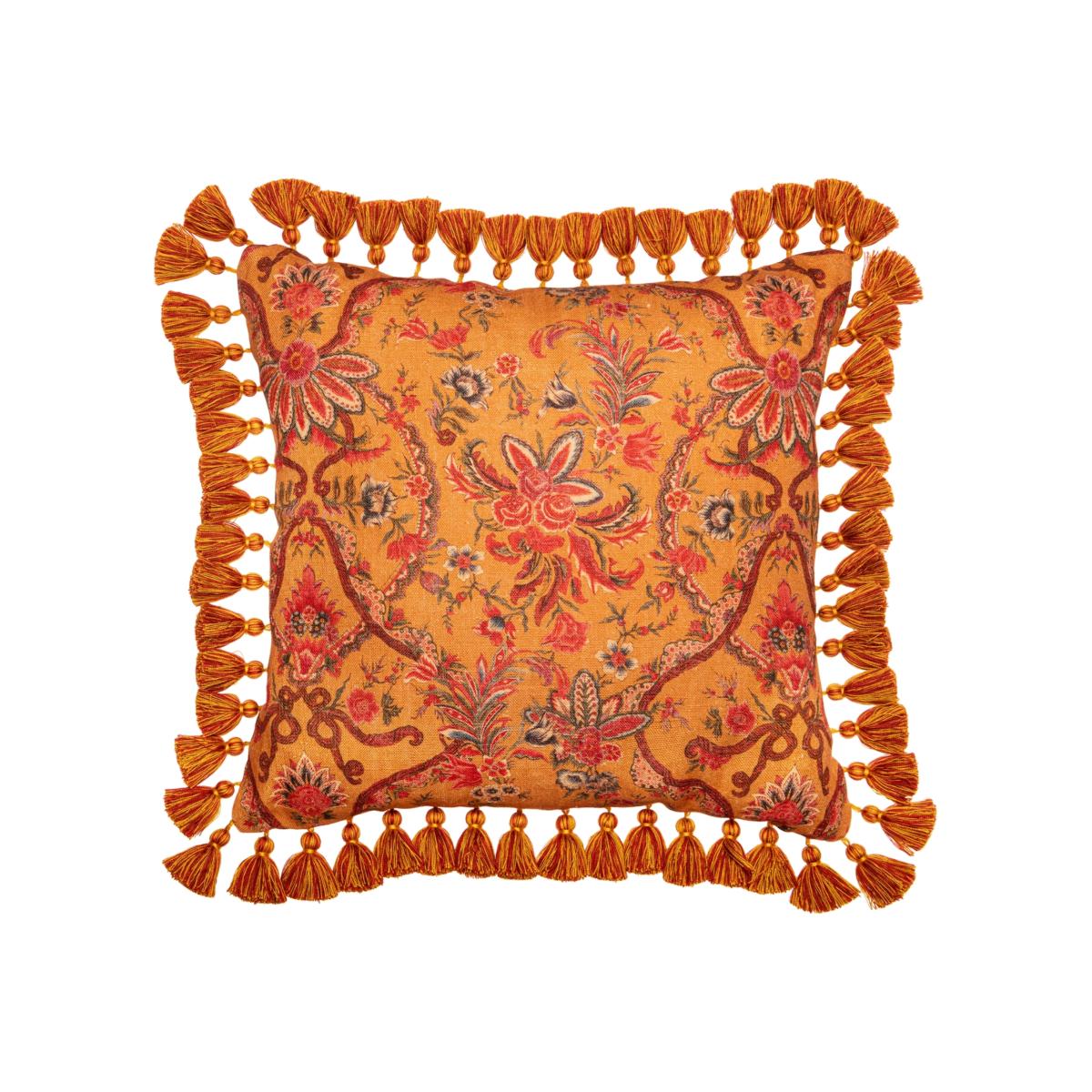 Encapsulating the ambience of the festival entirely, this vivacious design creates a showstopping statement with its swirling floral forms and bold colour palette. Referencing the fashions of the era, the popular psychedelic prints, and the birth of ‘flower power’, the WOODSTOCK cushion conveys the sense of freedom and courage which many witnessed at the festival itself. Decorated with matching cotton tassels that reminds of the old style Hindu cushions.
