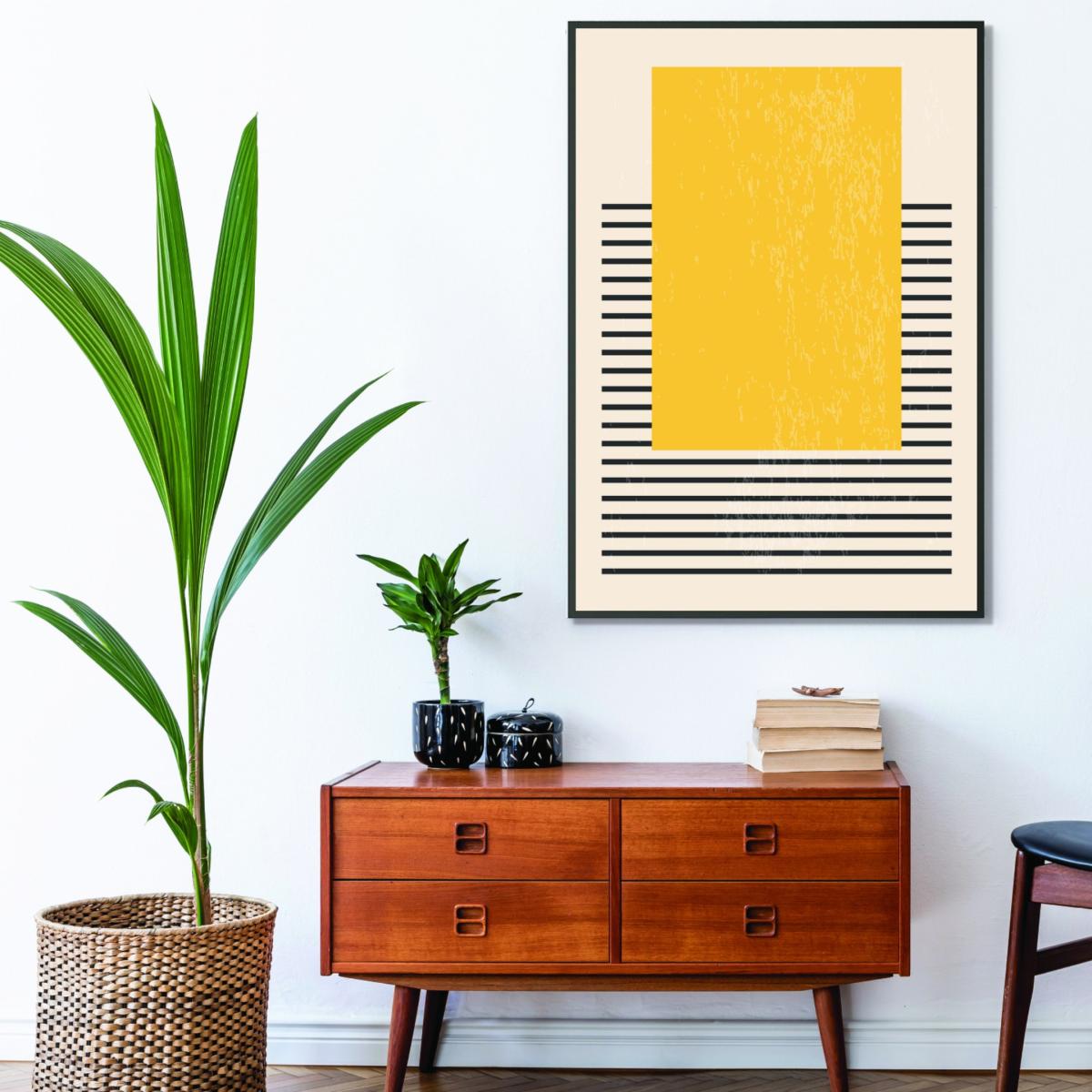 This vibe series print is a bold, eye-catching piece that works well in modern or minimalist interiors, injecting a punch of colour without overwhelming the space. I love how the vibrant yellow-orange hue can brighten up a neutral colour palette - think white walls, greys, or wooden accents. It’s versatile enough to be paired with sleek, contemporary furnishings or even eclectic styled rooms, adding a pop of colour that feels fresh and considered. For practical styling, hang it at eye level in places like living rooms, home offices, or hallways, and consider framing it in a simple, understated frame to keep the focus on the artwork itself. It’s an effective way to introduce colour and personality without clutter.