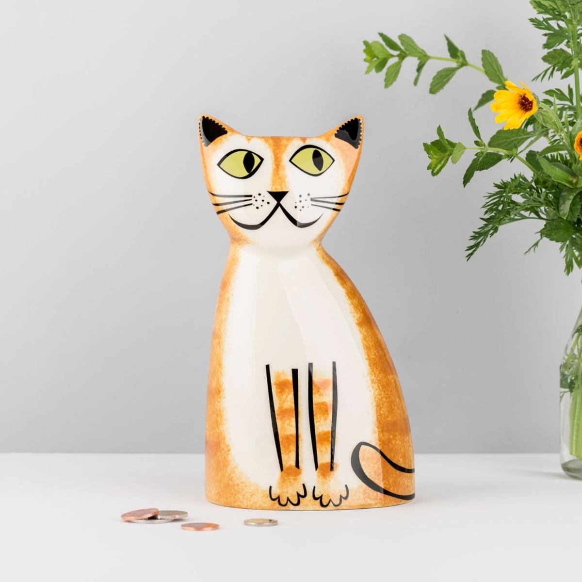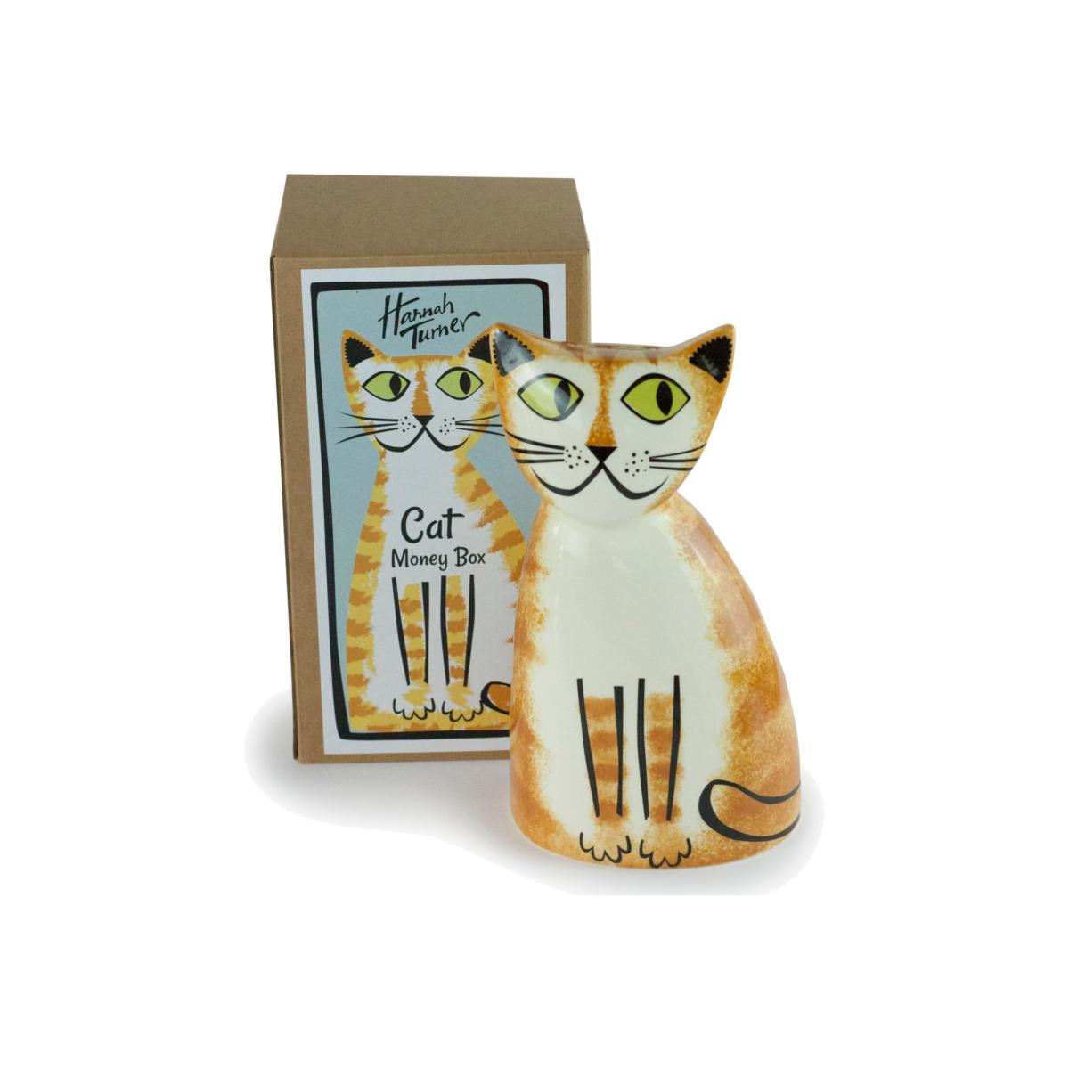 Meowww!! Meet the Ginger Cat money box, designed by Hannah Turner. Hand-painted with Hannah's classic kitty expressions, these pottery pussy cats are here to help you to look after your pennies and pounds. Hannah’s Cat Money Box has enormous feline appeal for adults and children alike and will capture the heart of any cat lover. The retro style of this cat has a very nostalgic feel and Hannah’s comic graphic style creates a characterful gift with bags of charm. There is a slot on the back of the head for the pennies or pounds and a rubber stopper in the base for emergencies!