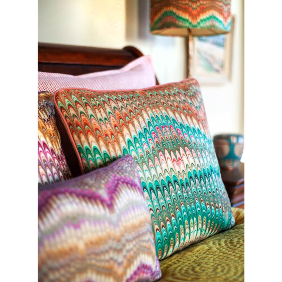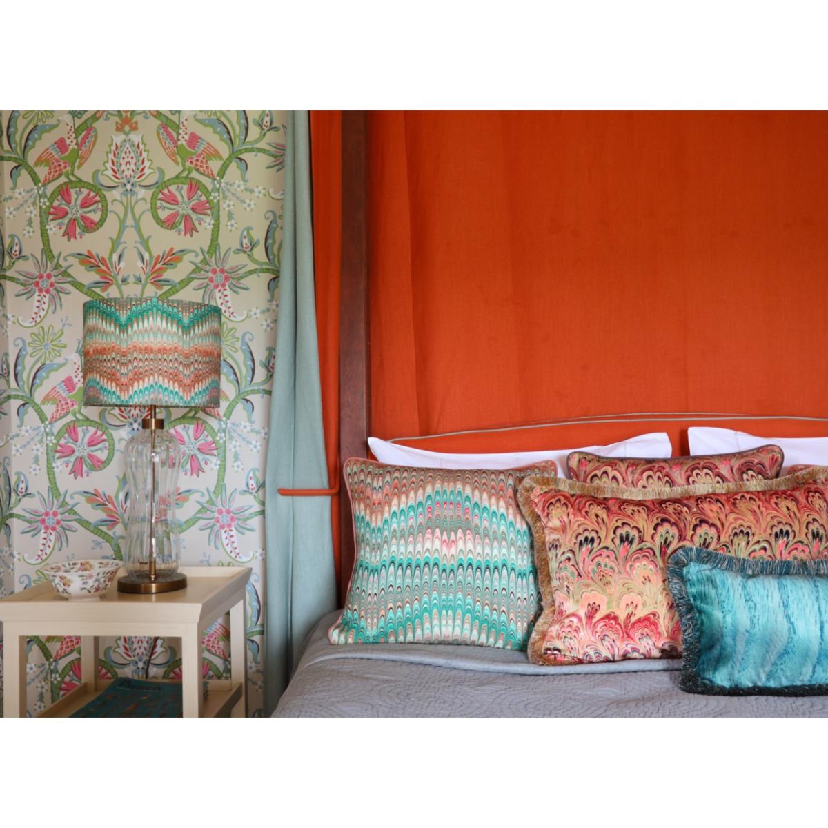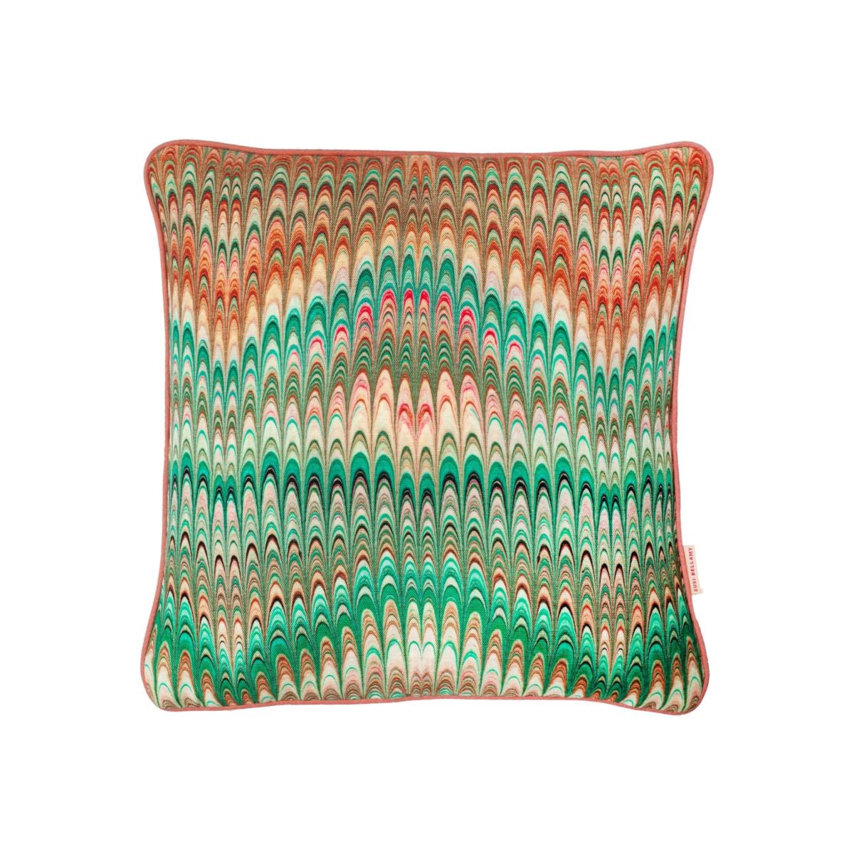 This exquisite linen square cushion is full of warmth and pattern with its exquisite colour palette of warm apricot, turquoise, emerald greens and cream. Pair it with our matching wallpaper, fabric and lampshade for the ultimate in pretty maximalism