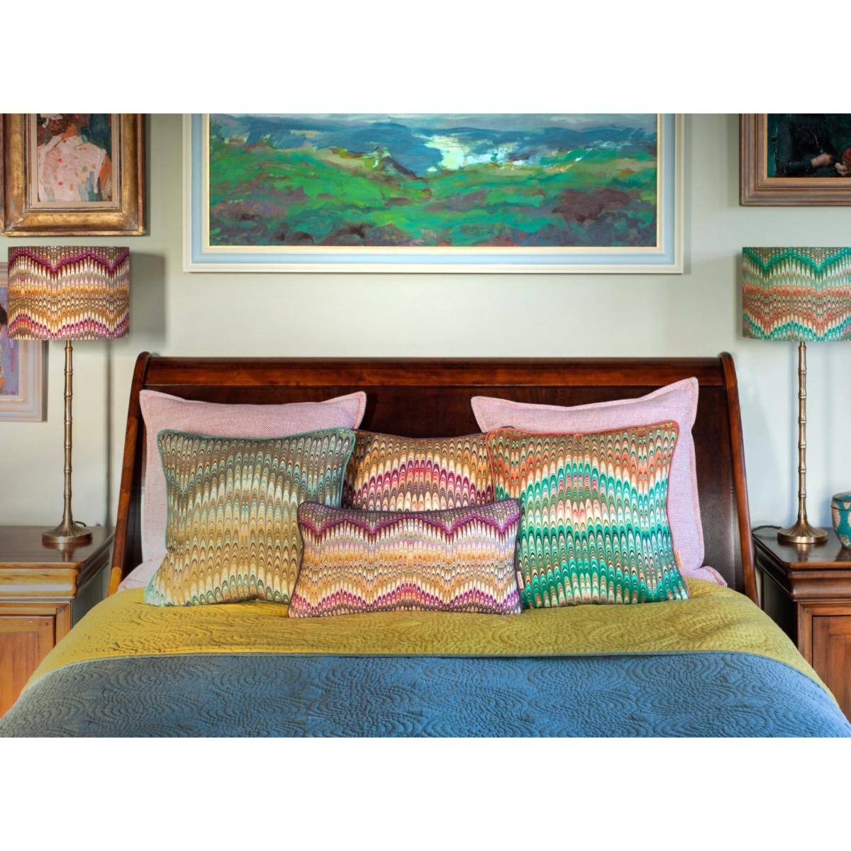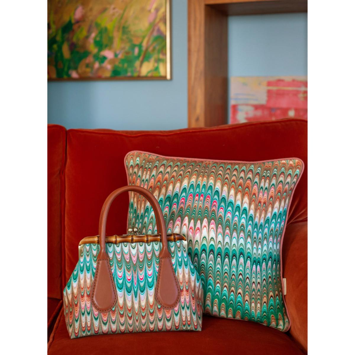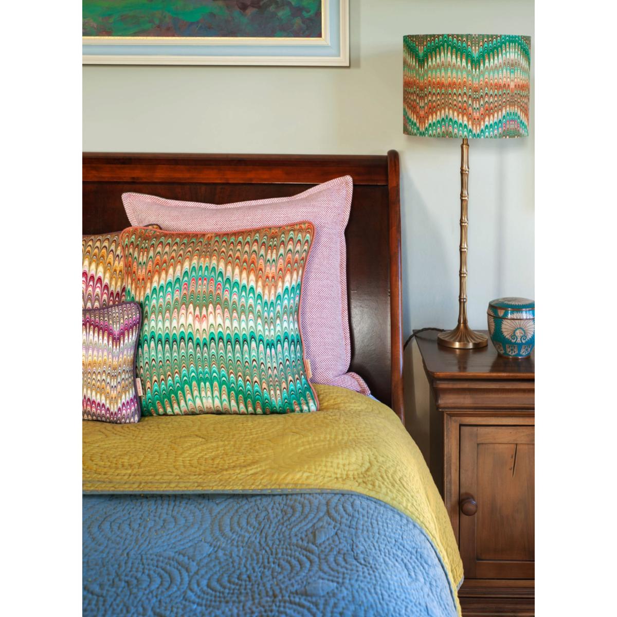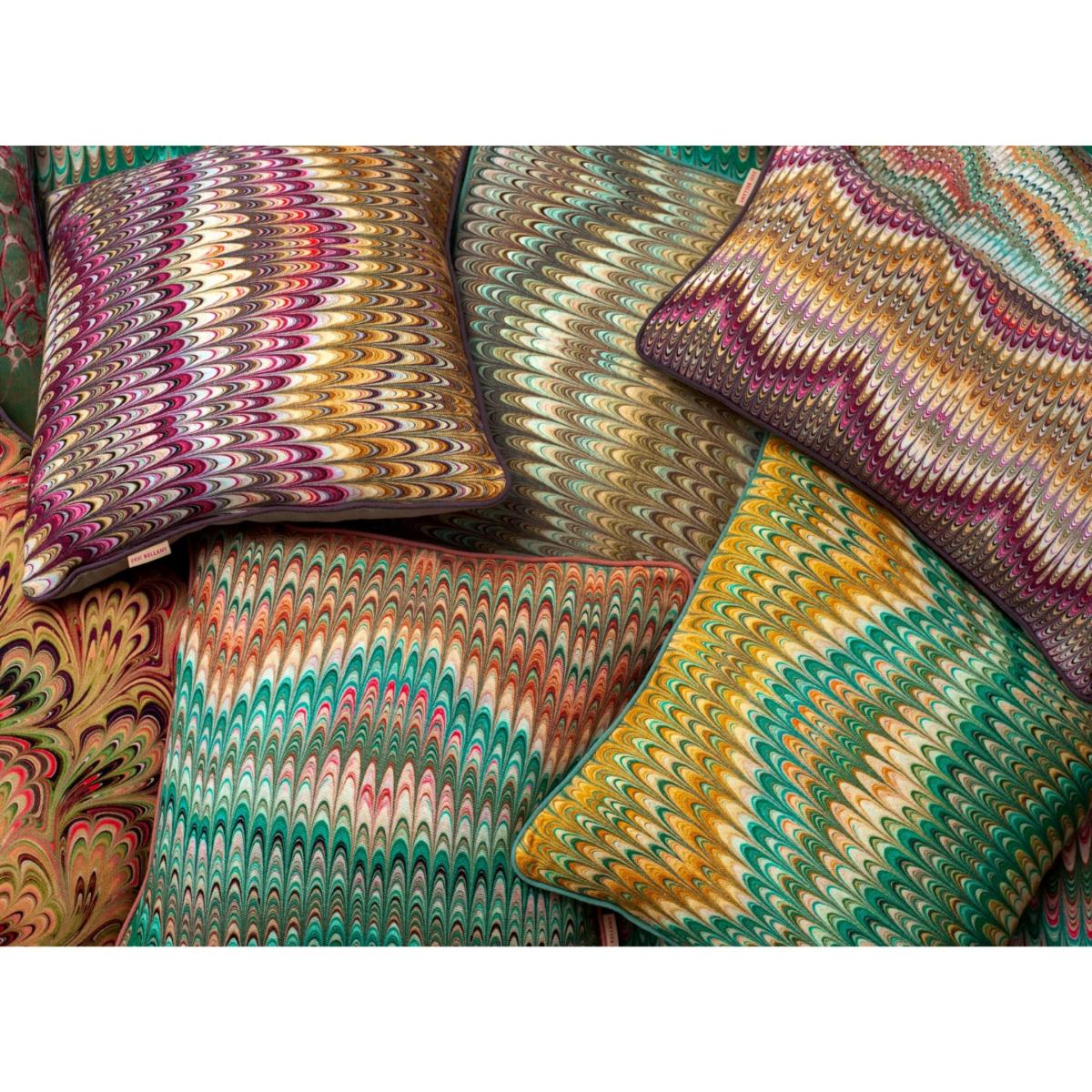 This exquisite linen square cushion is full of warmth and pattern with its exquisite colour palette of warm apricot, turquoise, emerald greens and cream. Pair it with our matching wallpaper, fabric and lampshade for the ultimate in pretty maximalism