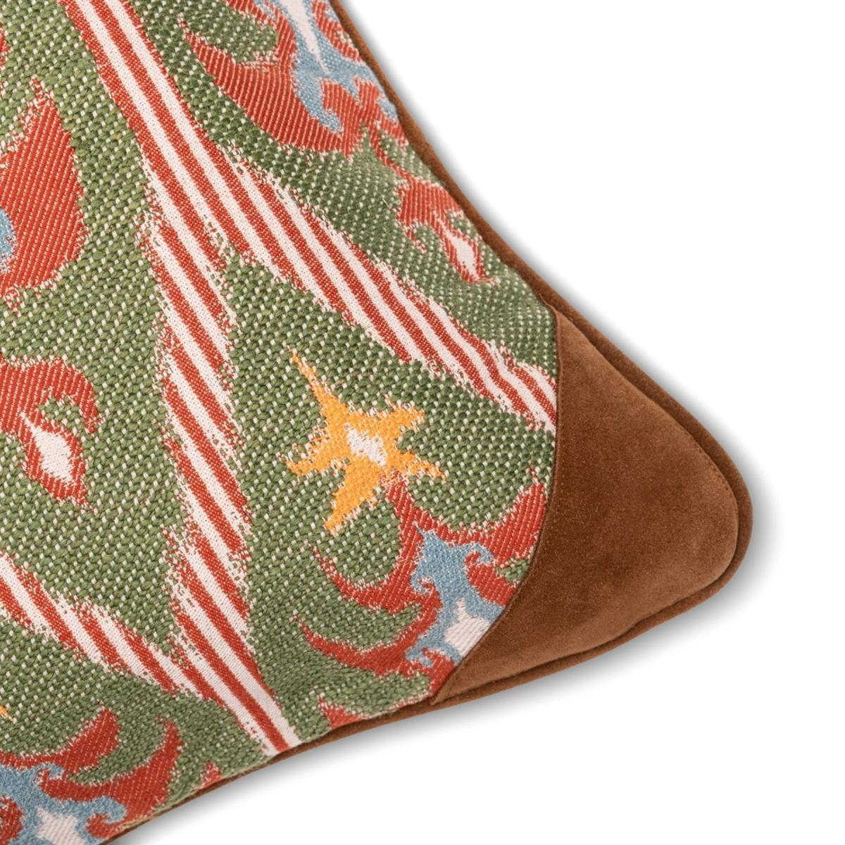 Contrasting materials come together on this plump cushion, which is sewn from the cheerful TANNENBAUM woven fabric. Edged with handsome brown leather piping and with sturdy leather corners, this luxury pieces it’s a great addition to any living room or office.