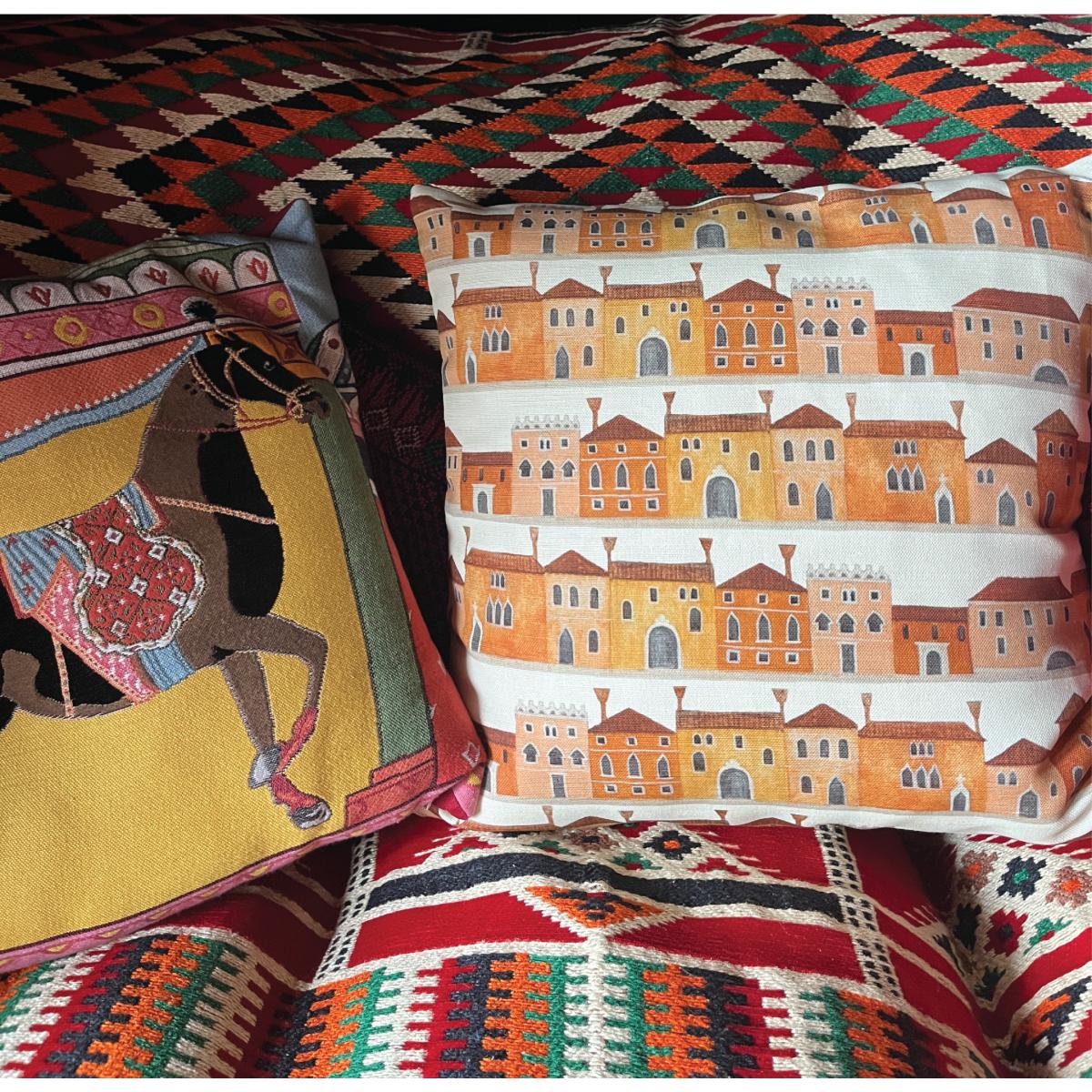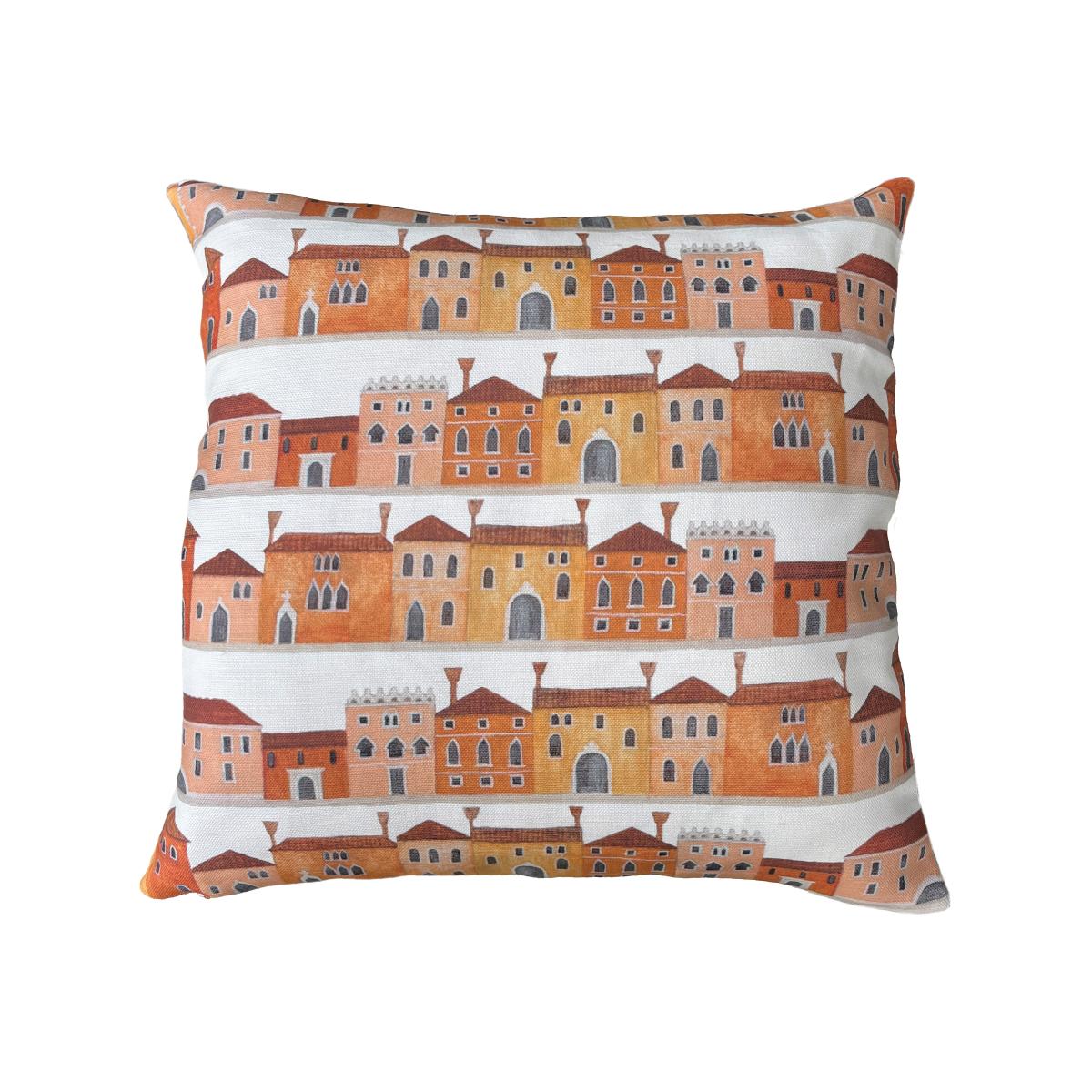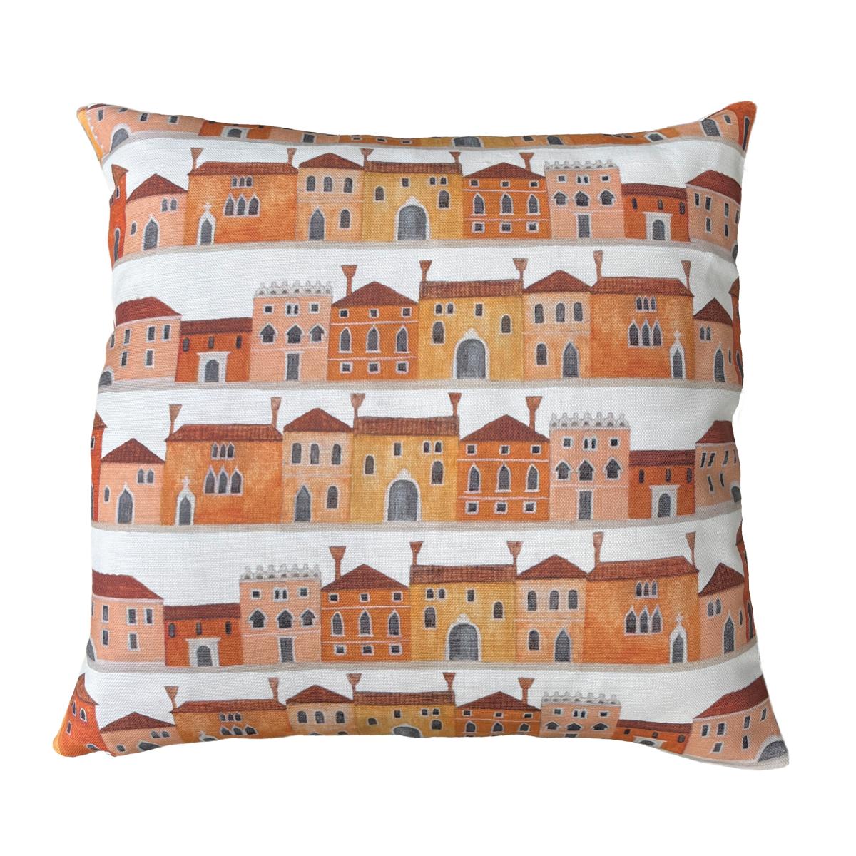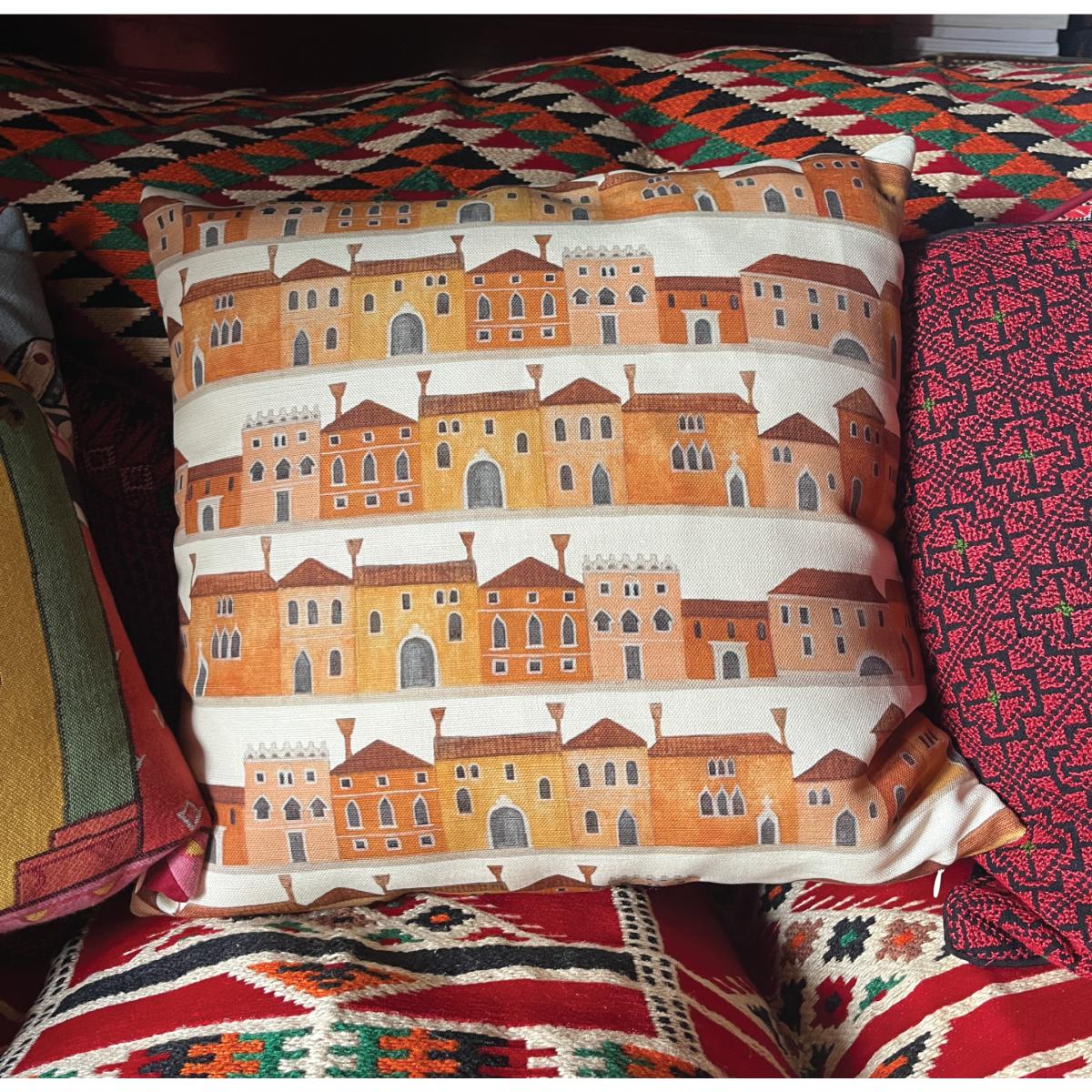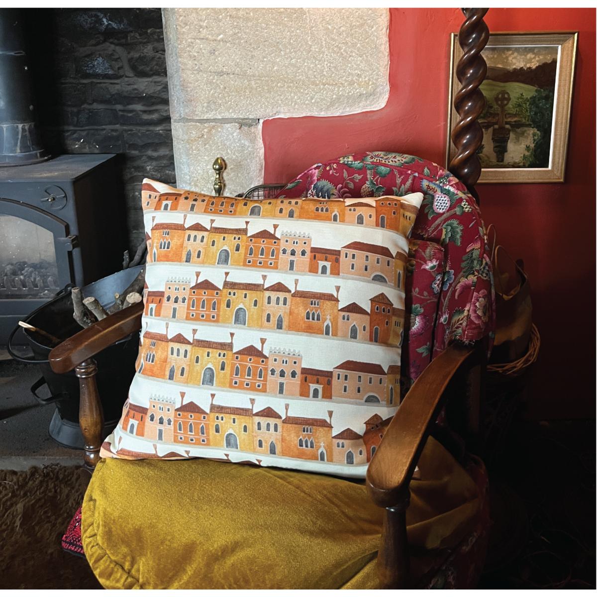 I love this cushion for adding a warm, playful touch to both contemporary and eclectic interiors. The vibrant yellow and orange tones are perfect for injecting colour into neutral schemes, and the Venetian house print offers a quirky, architectural detail that works well in living rooms or bedrooms. It pairs beautifully with natural textures like linen or wicker, and can serve as a statement piece on a sofa or armchair. Practical styling tips include balancing its bold pattern with solid cushions, or using it as a pop of colour on a sofa in a predominantly subdued palette. It’s ideal for bringing character and a dash of colour to spaces that need a lively yet cosy feel.