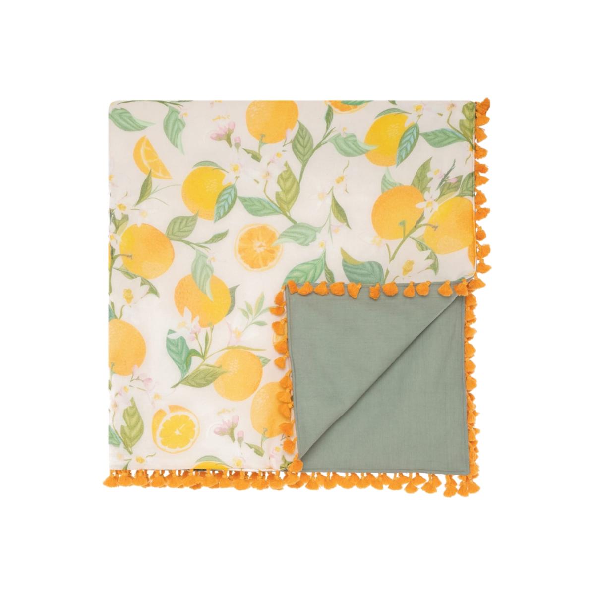 A light weight picnic blanket that can easily be rolled and cleaned in the washing machine after use. Featuring orange design on one side and plain olive on reverse. Can be used both ways. Finished with orange cotton tassels. – Orange fruit print – Cotton viscose on outer sides – Cotton wadding – Cotton tassels – Reversible