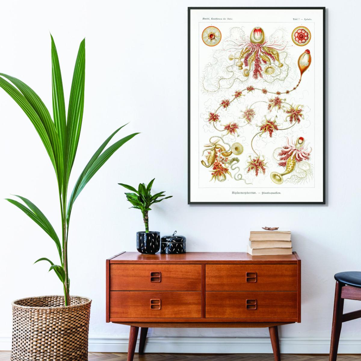 I love the vibrant colours and scientific beauty of the Yellow / Orange Siphonophorae-Staatsquallen print. It works particularly well in minimalist or contemporary interiors, where it can serve as a striking focal point. Because of its detailed and naturalistic style, it pairs beautifully with neutral tones, wooden furniture, or even industrial spaces to add a touch of organic interest. For practical styling, consider framing it in a simple, slim frame to keep the focus on the artwork, and position it at eye level in a living room or study to enhance its visual impact. This piece brings a sense of curiosity and colour without overwhelming the space, making it a versatile choice for art lovers who appreciate botanical or scientific themes.