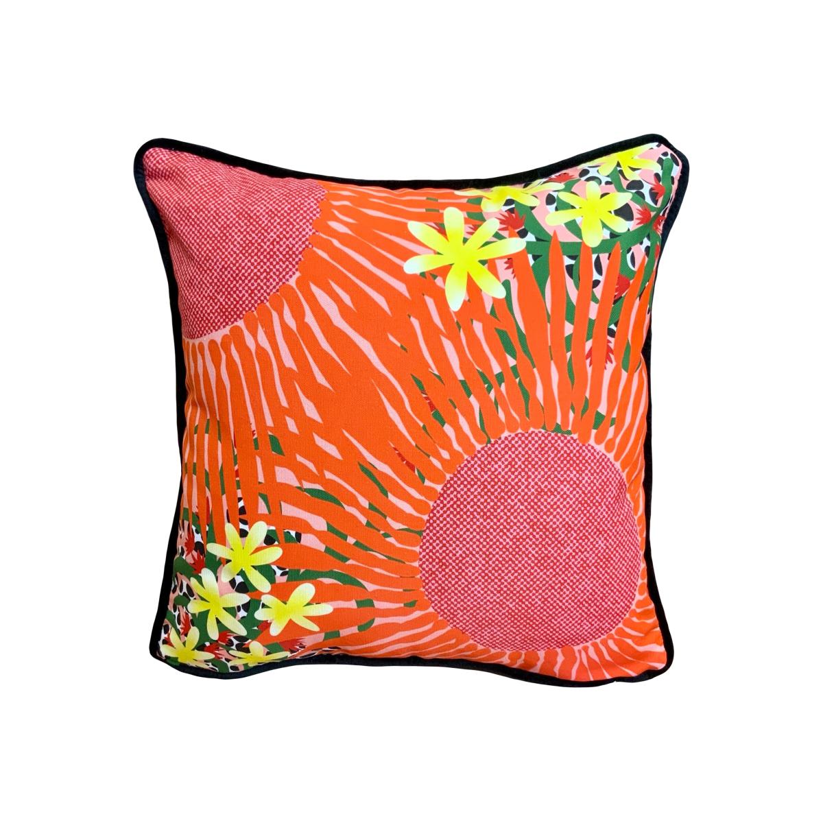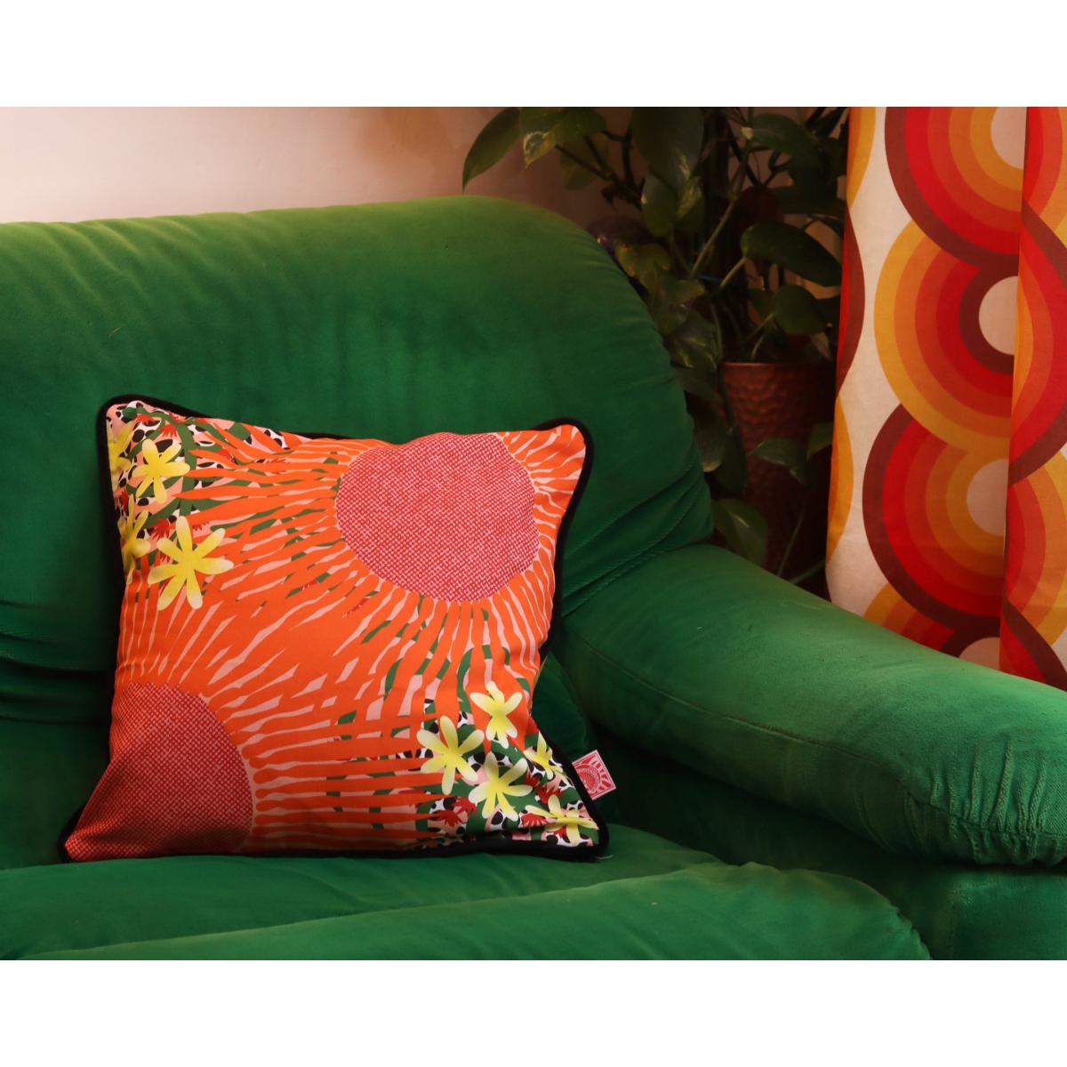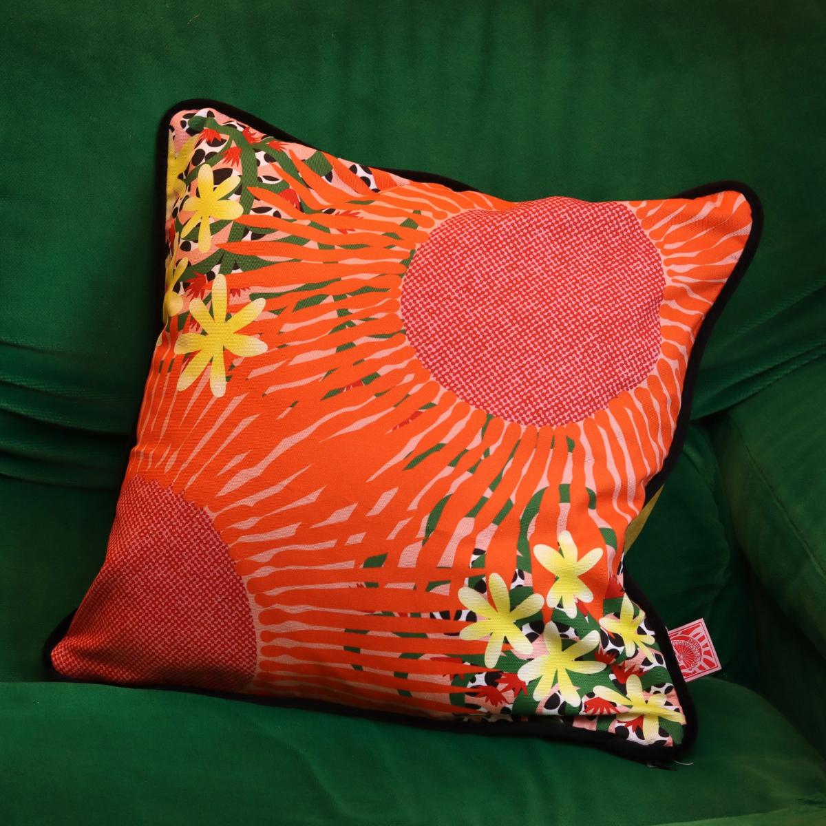 A handmade cushion by The Neighbourhood Threat. Featuring an original design by Holly Ramsay. This cushion will add some serious funk to your home! We use our colour- matching skills to select the best velvets and trimmings which really showcase the print! This cushion is trimmed with a black handmade velvet piping, and backed with luxurious yellow velvet. Size is approximately 45cm x 45cm.