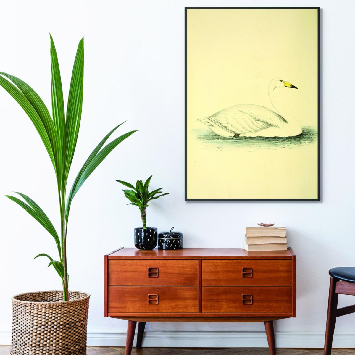I really like this swan print for its retro vibe and vibrant colours. The yellow and orange tones bring warmth, making it especially effective in rooms with neutral or cool colour schemes where it can serve as a lively focal point. It works well in eclectic or vintage-inspired interiors, as well as modern spaces that benefit from a pop of colour and playful character. For styling, consider pairing it with minimal furniture and a few accent pieces in complementary shades to avoid overwhelming the space. It looks great in a living room, hallway, or even in a bedroom where it can add a cheerful, relaxed touch. Framing it simply will keep the focus on the artwork and help it blend seamlessly into many interior styles.