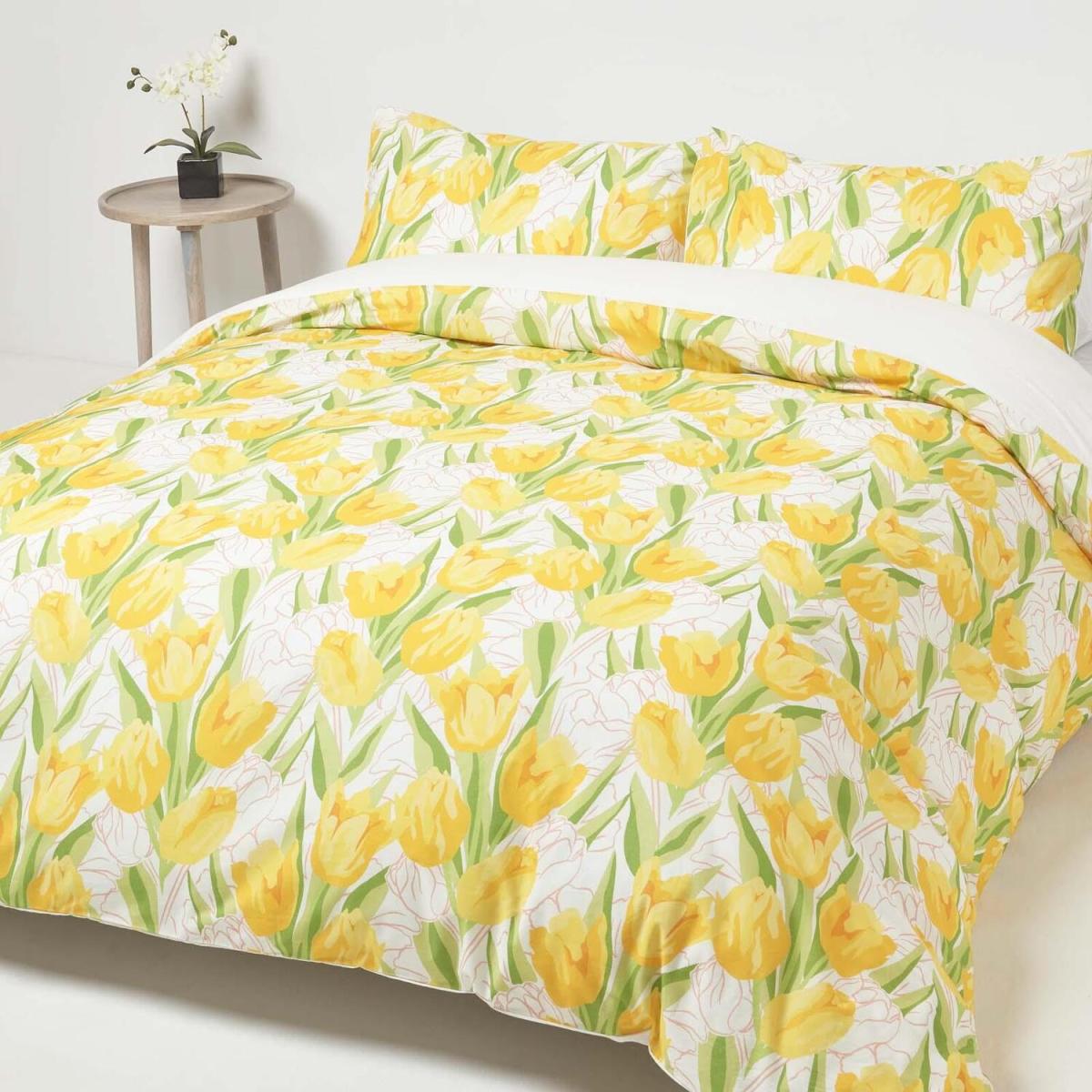 Introduce this floral tulip patterned bedding to your bedroom interior from Homescapes. This percale cotton duvet cover features vibrant floral design with bold tulips and green leaves set on a neutral background. Woven from durable 200 thread count (400 equiv) 100 cotton this strong and durable duvet cover is designed to last and will become softer over time. Digitally printed to ensure lasting vibrant colour, this striking pattern has been exclusively designed by Homescapes and is a limited edition run. Bed sheets quick and easy, featuring a quick zip closure and the pillowcases have a standard envelope close for a neat look. Available as a single set (including one pillowcase), as well as a double, king and super king size (includes two pillowcases). Don't forget to complete the look with our co-ordinating collection of yellow and white pillowcases, flat and fitted sheets available in a range of thread counts.