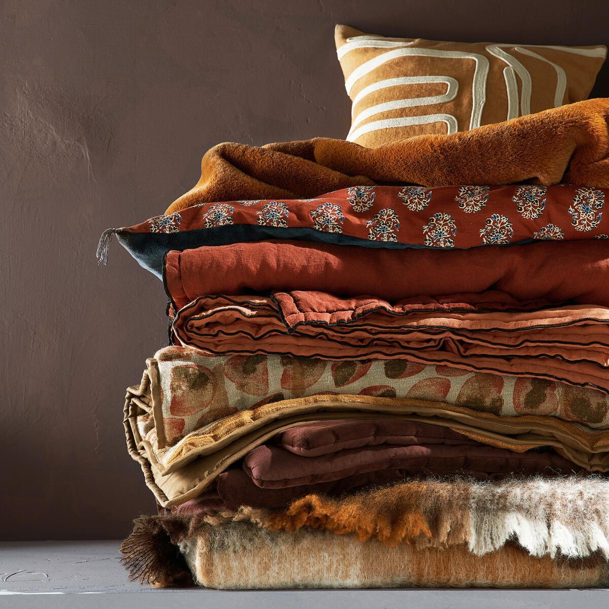 Natural materials and refined craftsmanship... the Yelviz quilt has a cotton velvet side enhanced with embroidered puffs. The back is in plain pure linen. Authentic and elegant.