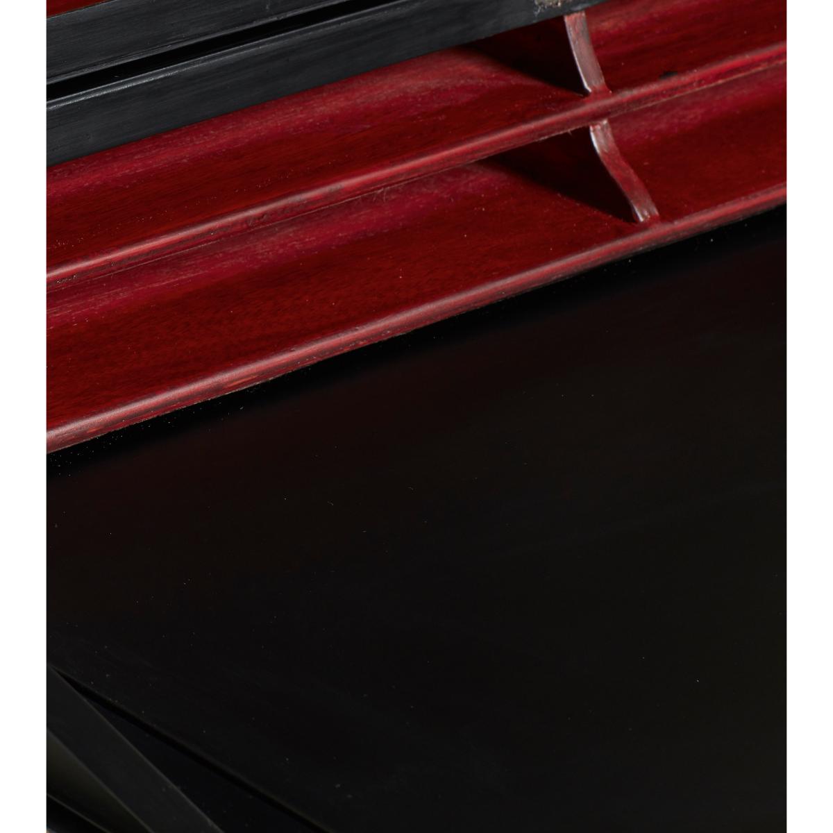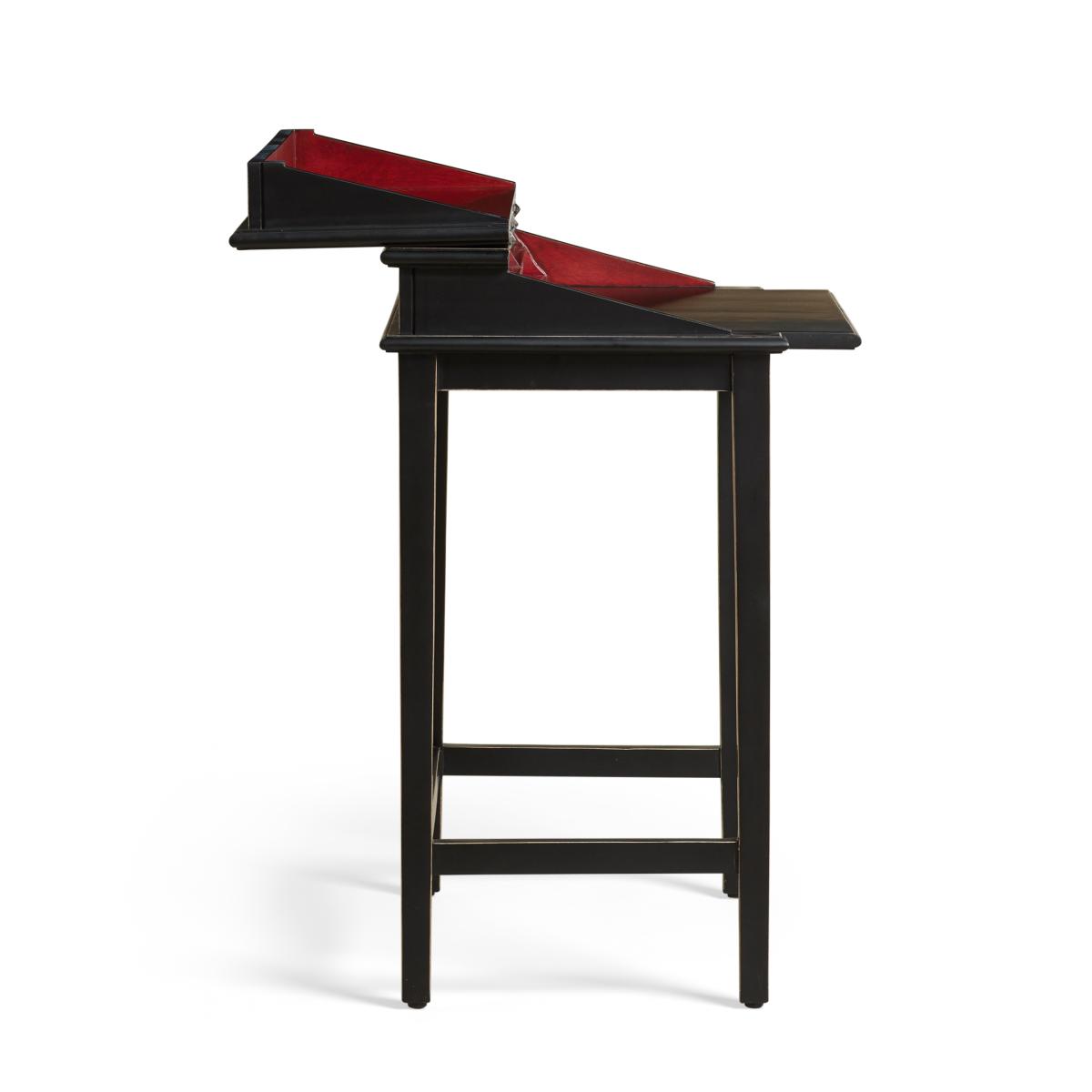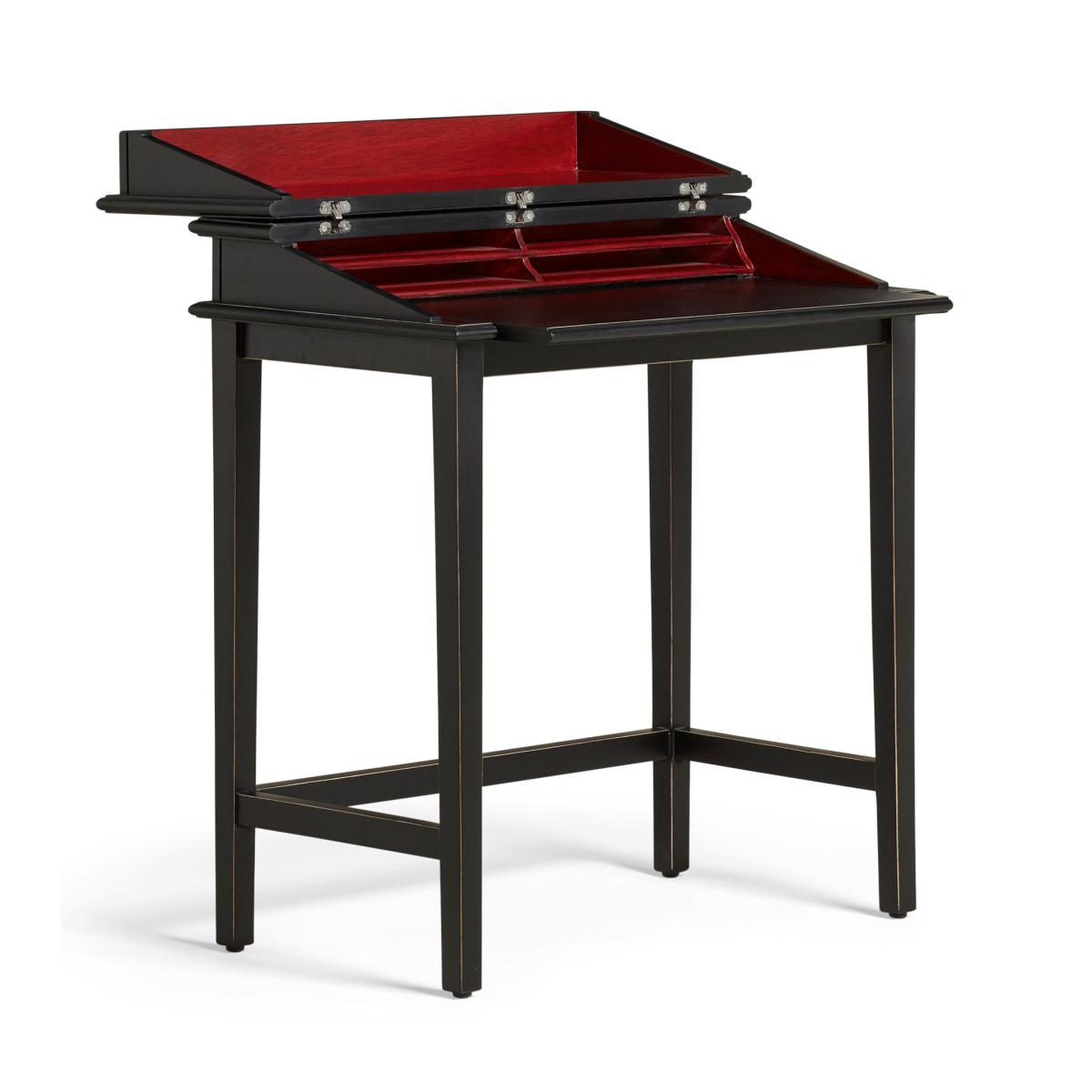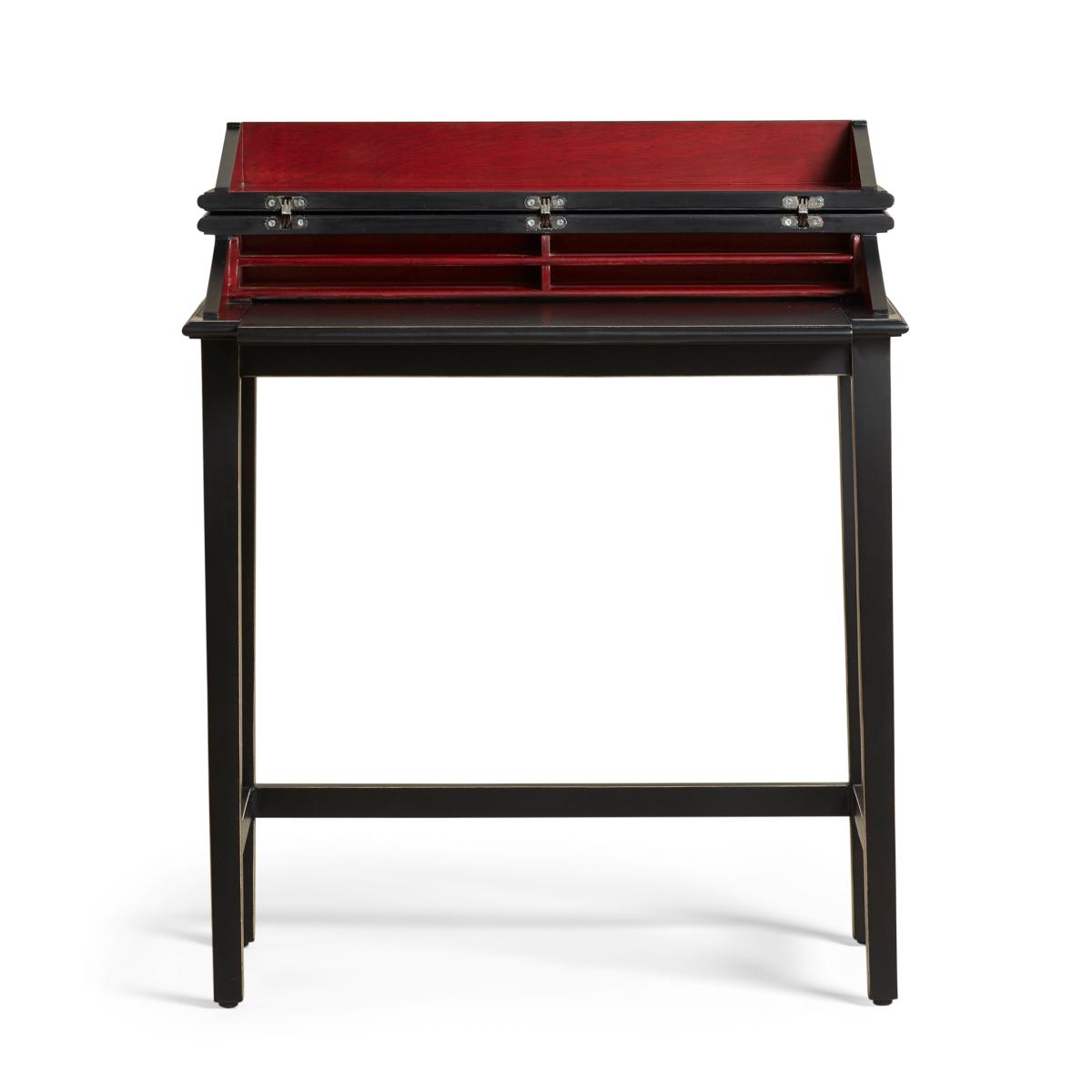 Quietly confident, the Chinese-influenced Yishu Desk hides a vibrant red interior within its compact, black-painted form. Lift up its weighty hinged lid to reveal four hidden cubby holes and an effective workspace that can be pulled out for even more surface area on which to work. The perfect desk for both saving and creating space, it can be folded away at the end of the working day to keep small spaces clutter-free.