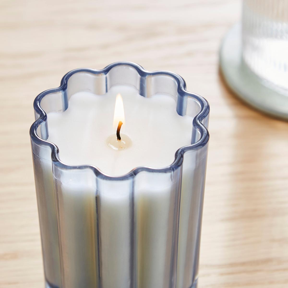 * Refreshing scent with floral notes * Blue scalloped glass container * Stylish vessel for reuse once empty Surround yourself with the refreshing blend of ylang ylang and neroli, balanced with invigorating mint, eucalyptus, and soft floral notes of lavender, rose, and geranium. An earthy vetiver base adds warmth, creating a beautifully layered fragrance that soothes and uplifts. With a burn time of up to 35 hours, this candle is perfect for relaxing evenings or refreshing your space. An elegant scalloped blue glass vessel adds a stylish touch to any room. Once the wax has melted away, re-purpose the glass for storage or display. A thoughtful combination of fragrance and design, perfect for gifting or treating yourself.