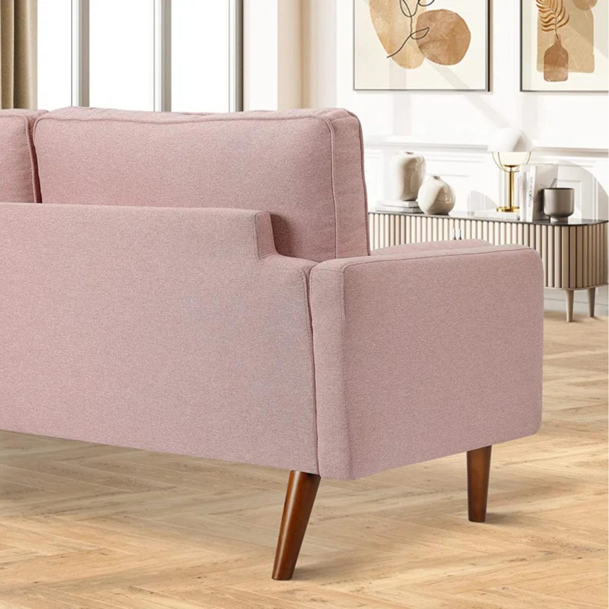 I love this pink linen sofa for its versatile and approachable style, making it a fantastic focal point in both modern and retro-inspired interiors. Its square arms and tufted design give it a classic yet contemporary vibe, while the gentle pink hue adds a touch of colour without overwhelming the space. It's perfect for a cosy lounge or a guest room. Practical styling tips include pairing it with neutral or patterned cushions to add depth, and accessorising with minimalist or vintage furniture to complete a cohesive look. Given its colour, it's ideal in light-filled rooms or spaces with other pastel or natural tones to maximise its soft, inviting appeal.