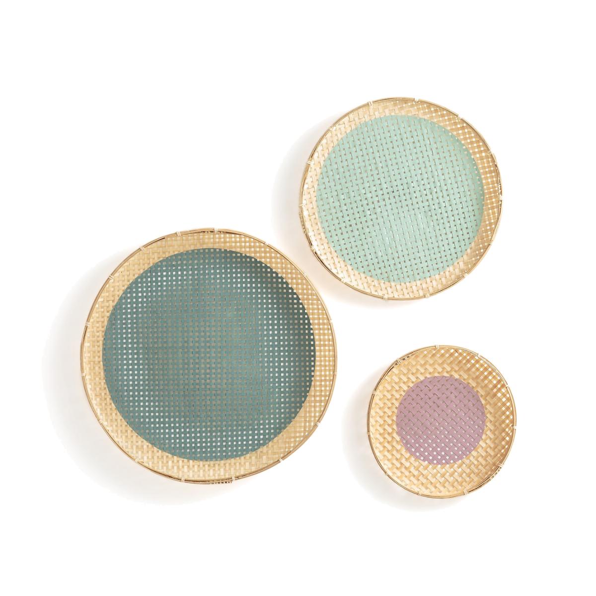 Set of 3 Yokou wall baskets. Perfect for adding a touch of colour to your interior decor. Product Details • Hand woven bamboo. • Sold in packs of 3 baskets of different sizes and different colours. Dimensions • Disc 1: Diameter 30cm • Disc 2 : Diameter 40cm • Disc 3: Diameter 50cm