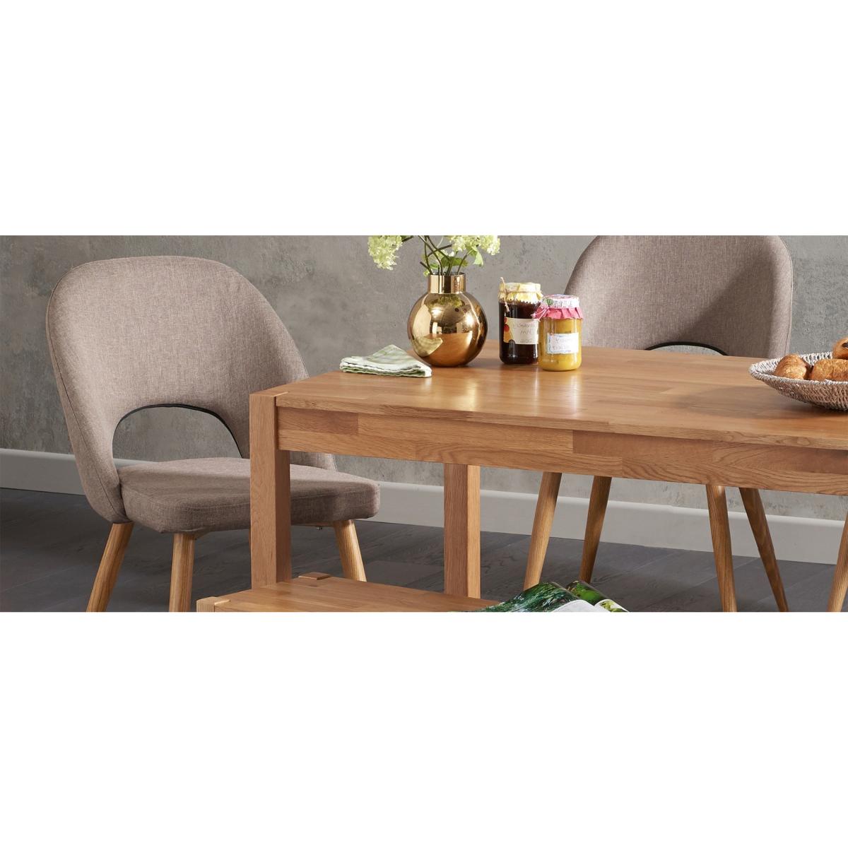 This set is a great blend of practicality and contemporary style. The solid oak table offers a natural warmth that works well in both modern and more industrial interiors, while the grey fabric chairs add a soft, versatile touch that complements neutral palettes or bold accent colours. The bench provides a flexible seating option and helps maximise space, making it ideal for casual family meals or those who often entertain. For styling, consider simple tableware and centrepieces to keep the look clean; incorporating textured textiles like knitted seat pads or placemats can add subtle layers of interest. Overall, this ensemble suits open-plan living or a cosy dining nook, bringing understated elegance and functionality.